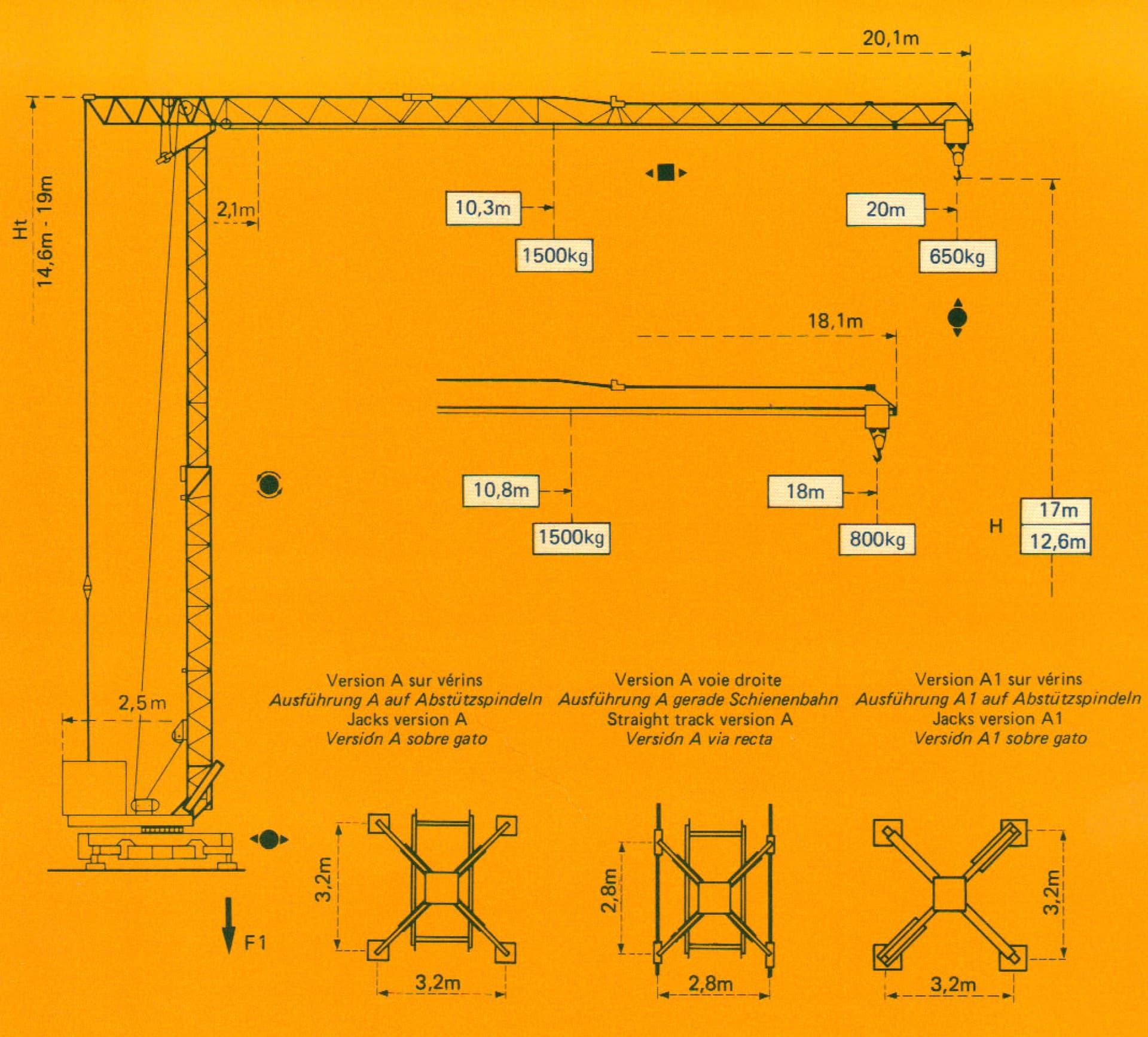1500 kg en milieu de flèche et 650kg en bout de flèche à 20m. (voir schéma)
