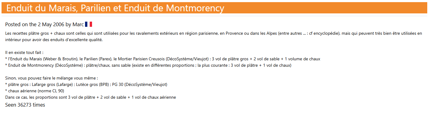 J’ai écrit à Vieujot qui confirme qu’il a même développé des mélanges plâtre et chaux exprès pour remplacer le mortier GREB, que ces mélanges ont évolué avec le retour d’expérience des chantiers…