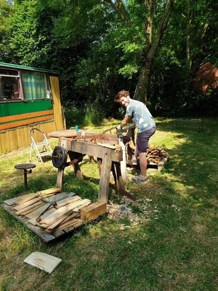 Je te propose une journée conviviale et participative ! On commencera par échanger autour de l’assainissement écologique sur mon terrain, puis on mettra la main à la pâte pour couvrir ensemble un pan du tipi avec des bardeaux de châtaignier.
