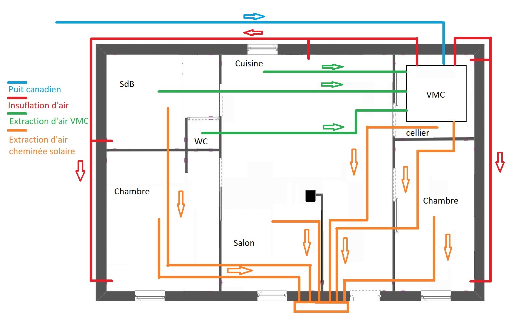 Concrètement, j’installe un puits canadien couplé avec une VMC double flux et une cheminée solaire. L’isolation sera faite par l’extérieur : ossature bois et fibre de bois pour les parois, ouate de cellulose soufflée pour le plafond. Le chauffage minimaliste sera assuré par un poêle à granulés. Le tout bien orienté sud, avec panneaux solaires, serre et récupération d’eau de pluie.
