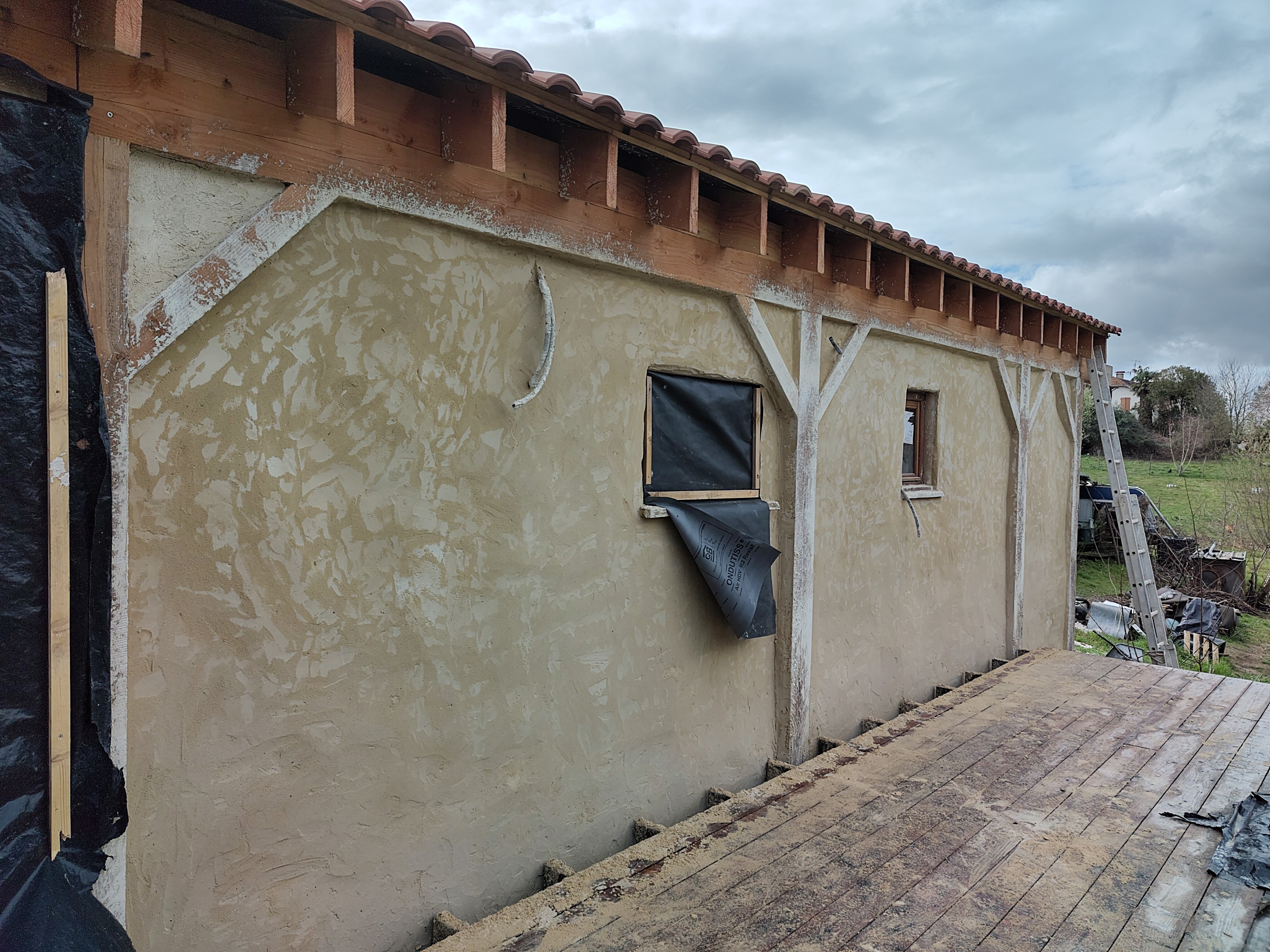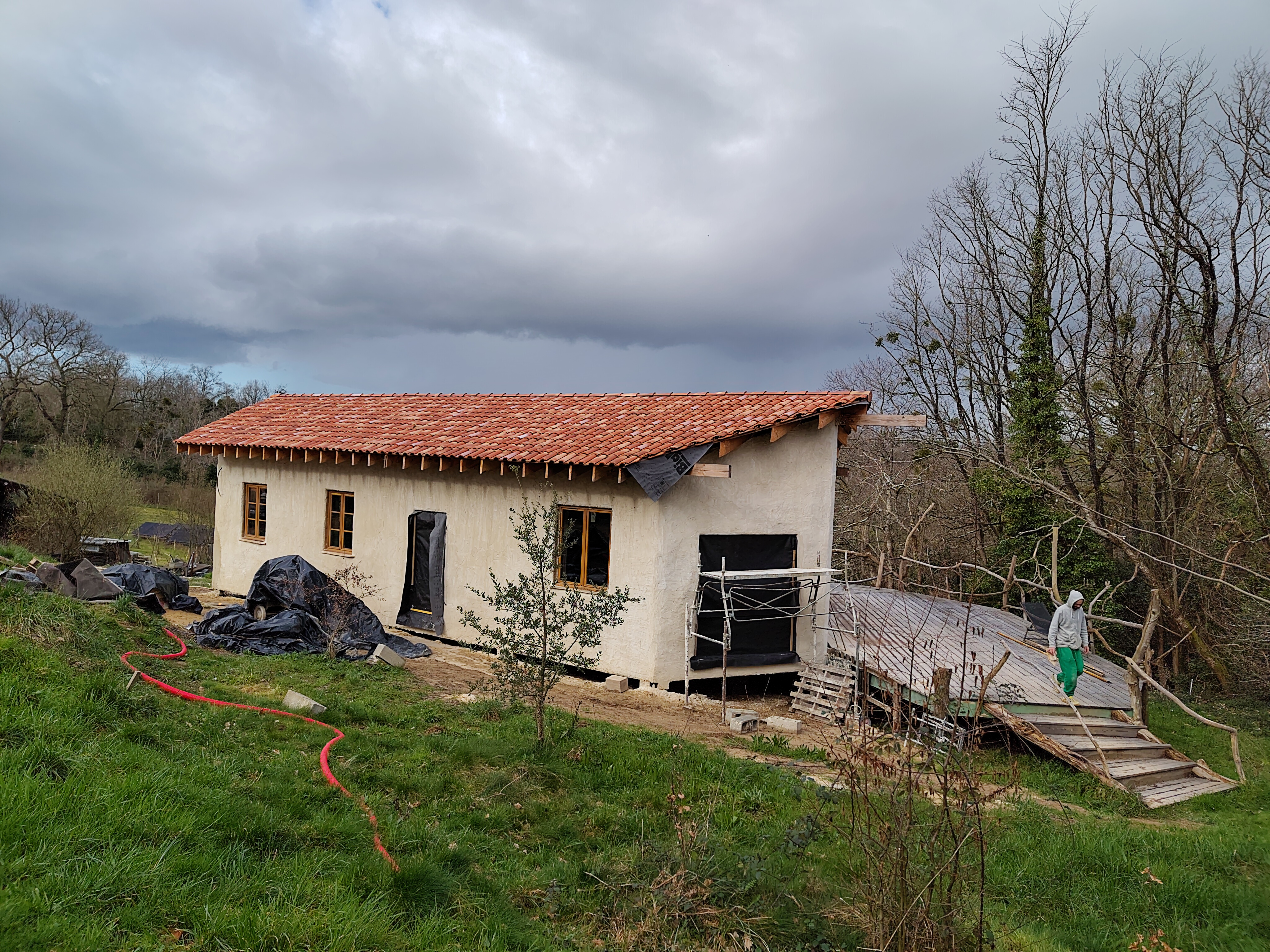 Les fondations mêlent poteaux béton et cave semi-enterrée. La charpente est traditionnelle, les enduits extérieurs en chaux-sable sont en cours de finition. À l’intérieur, tout reste à faire : la paille est encore visible !