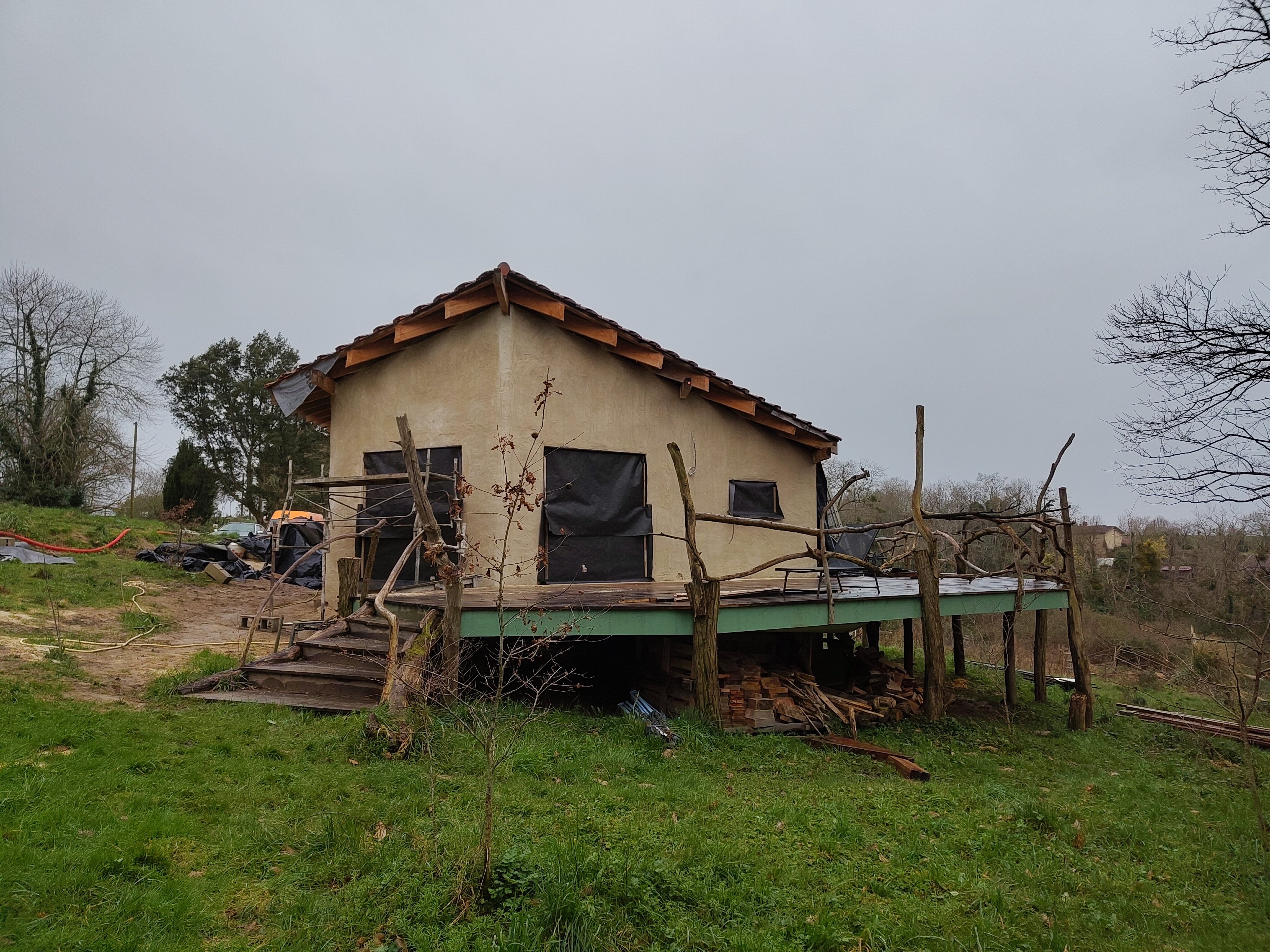 Je t’accueille dans notre maison ossature bois à remplissage paille, encore en chantier. C’est un projet 100% auto-construit jusqu’ici, pensé comme une maison passive avec une architecture atypique.