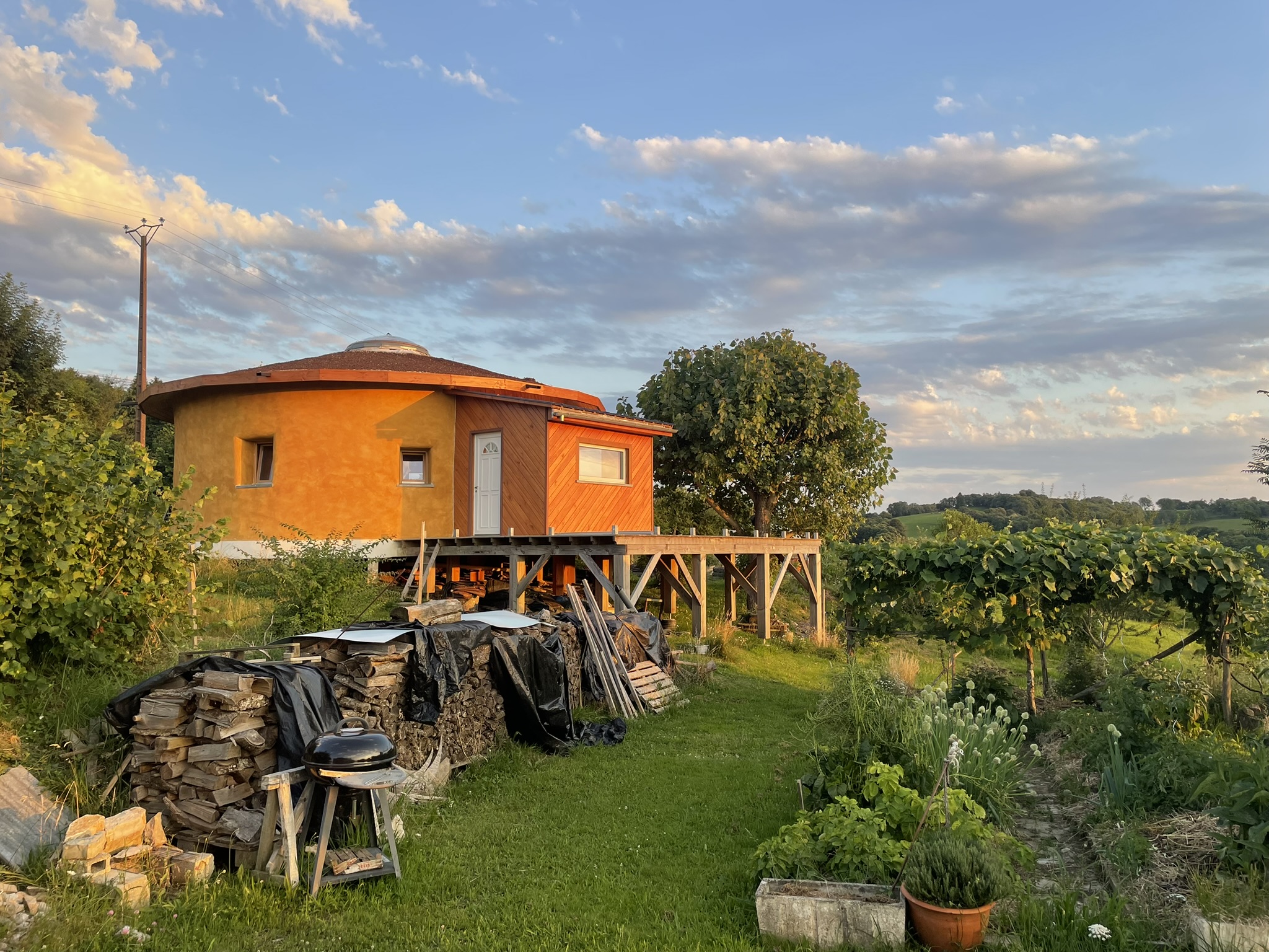 Je t’accueille dans ma maison ronde bioclimatique de 67 m², construite sur pilotis avec une grande terrasse de 80 m² orientée sud-ouest. La structure en ossature bois est isolée en paille, avec des enduits terre à l’intérieur et chaux pigmentée à l’extérieur. La charpente autoportée en structure réciproque, inspirée du principe Héliyourte, supporte une toiture végétalisée.