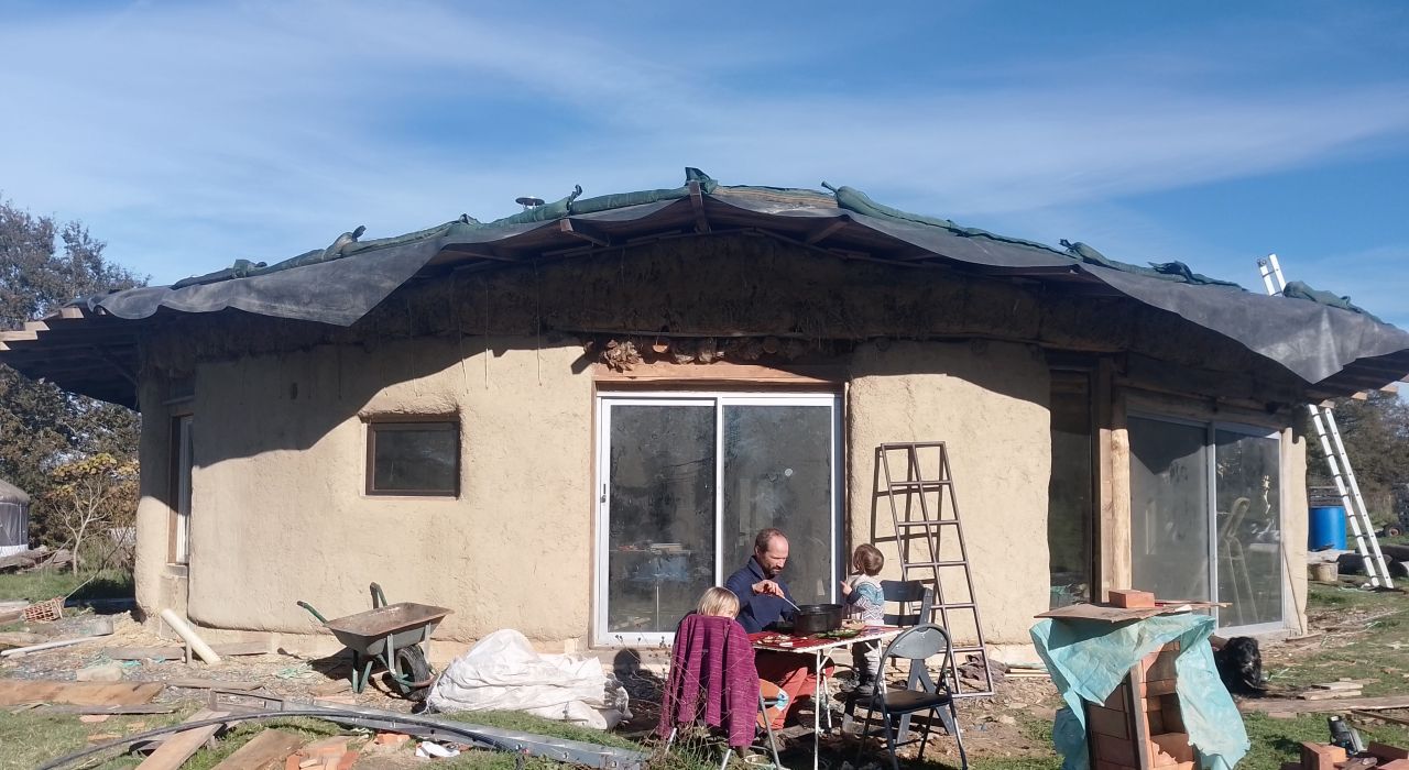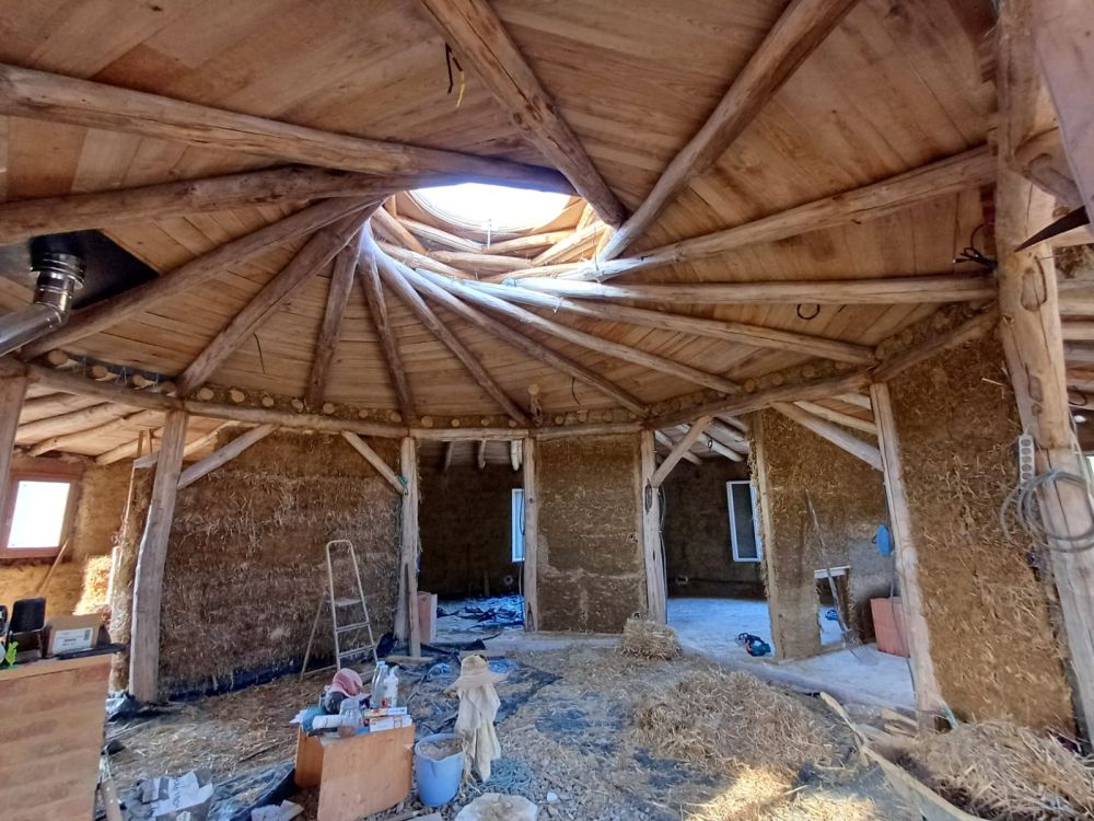 On t’accueille dans notre paillourte, une maison ronde en paille que nous construisons avec les ressources de notre ferme et des alentours. Nous avons choisi la technique de la paille porteuse avec charpente réciproque poteaux poutres, une méthode techniquement simple et accessible à tous. Ce qui rend ce projet singulier ? Tout est pensé pour l’autonomie : nous sommes paysans en autonomie énergétique et presque alimentaire, et notre maison s’inscrit dans cette même logique. La plupart des matériaux viennent de chez nous ou du voisinage. Une construction économique, écologique, et à taille humaine pour notre famille de 4 personnes.