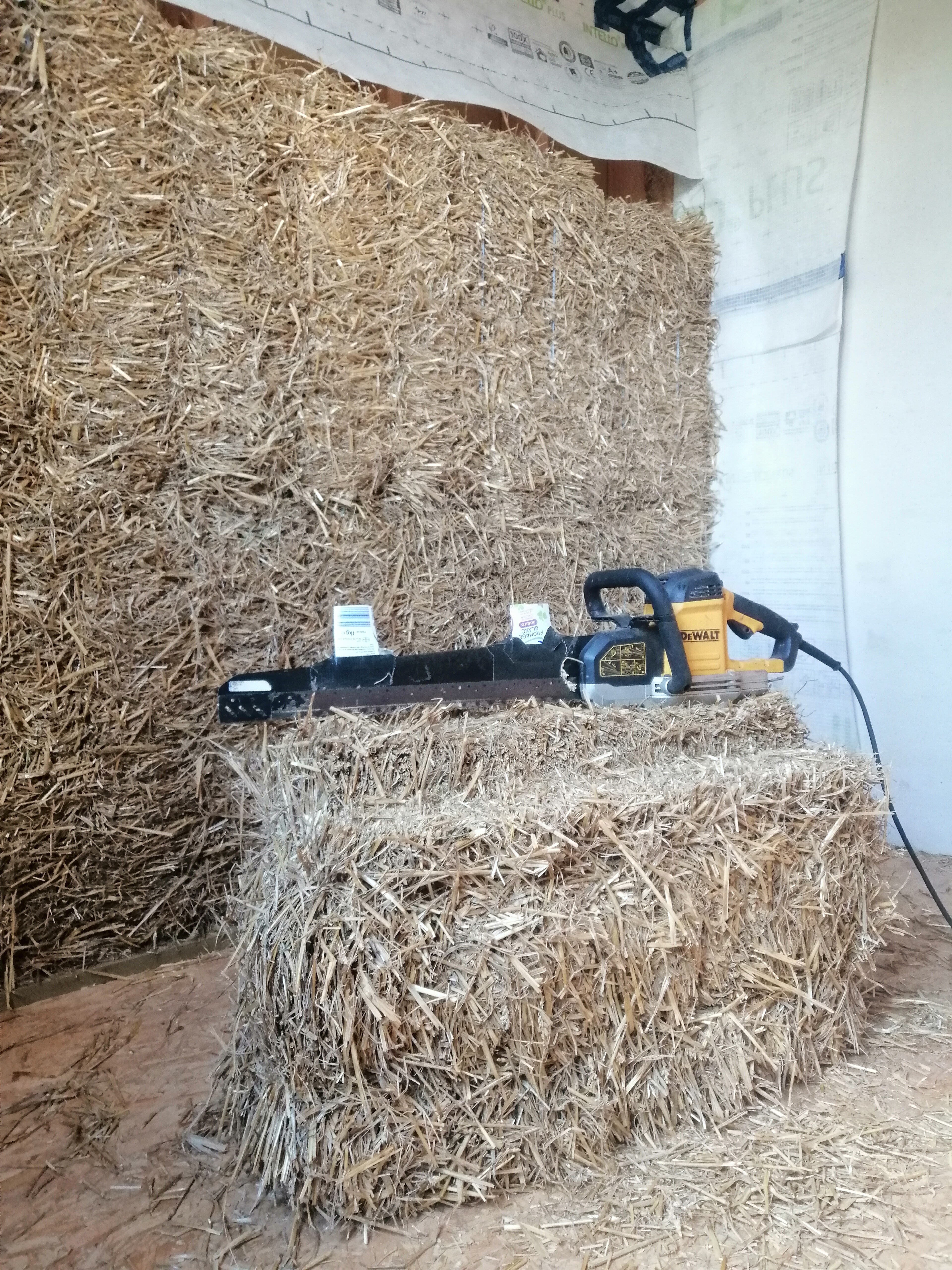 Nous sommes actuellement à l’étape du frein vapeur, avant l’insufflation de la ouate, et une partie de la maison est isolée en bottes de paille. C’est donc un moment idéal pour échanger sur ces techniques et sur le parcours global d’une construction neuve.