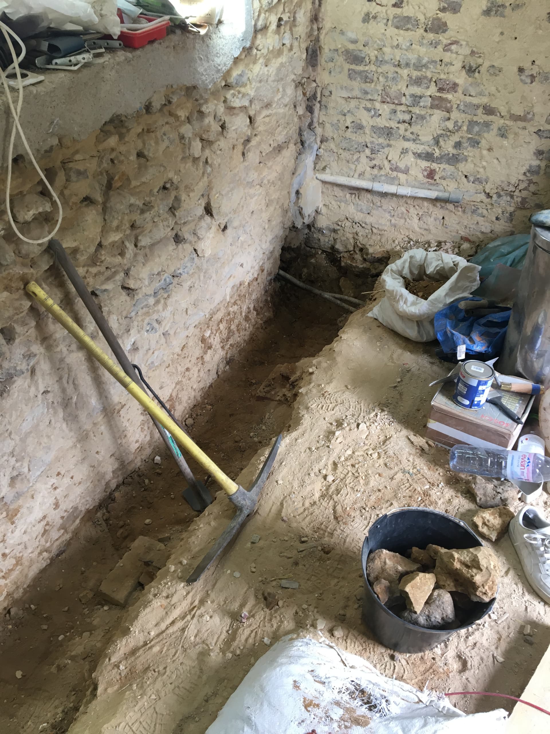 La partie en rouge c’est l’emprise de la cave. Le plancher voûtains s’arrête à 50cms du mur de pierre et en décaissant les poutrelles et les briques sont apparents.