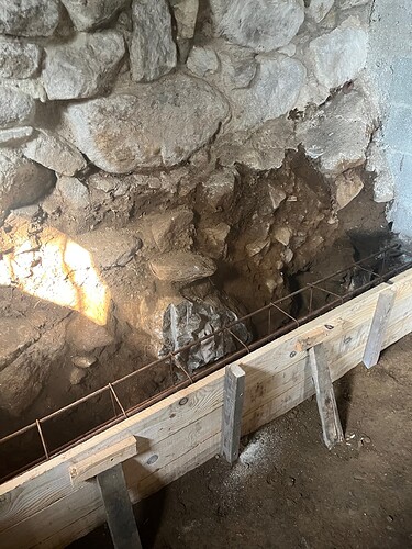 On a coulé des fondations en pied de mur (devant, pas dessous) sur 33 cm de profondeur, car il nous fallait au moins 30 cm de misapor pour arriver au R souhaité (pour avoir les subventions). et environs 30cm de large.