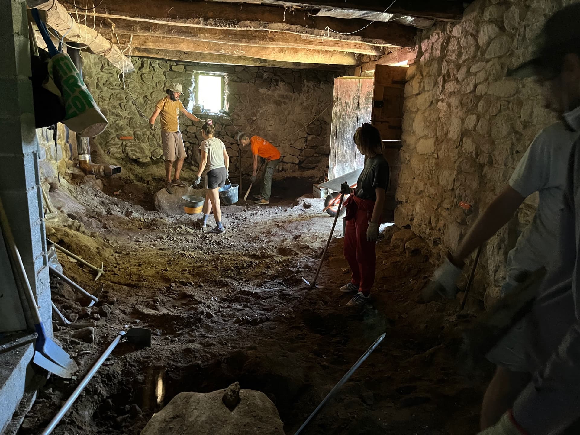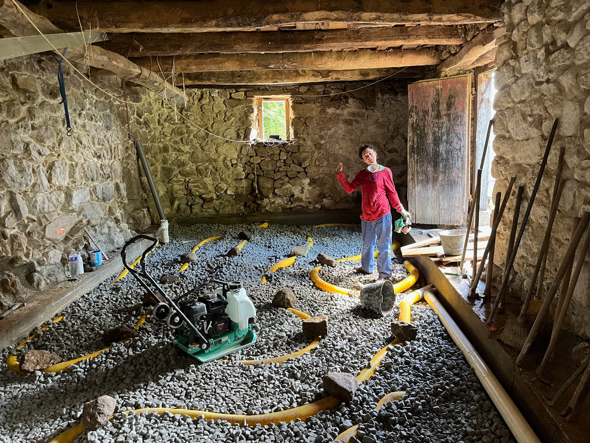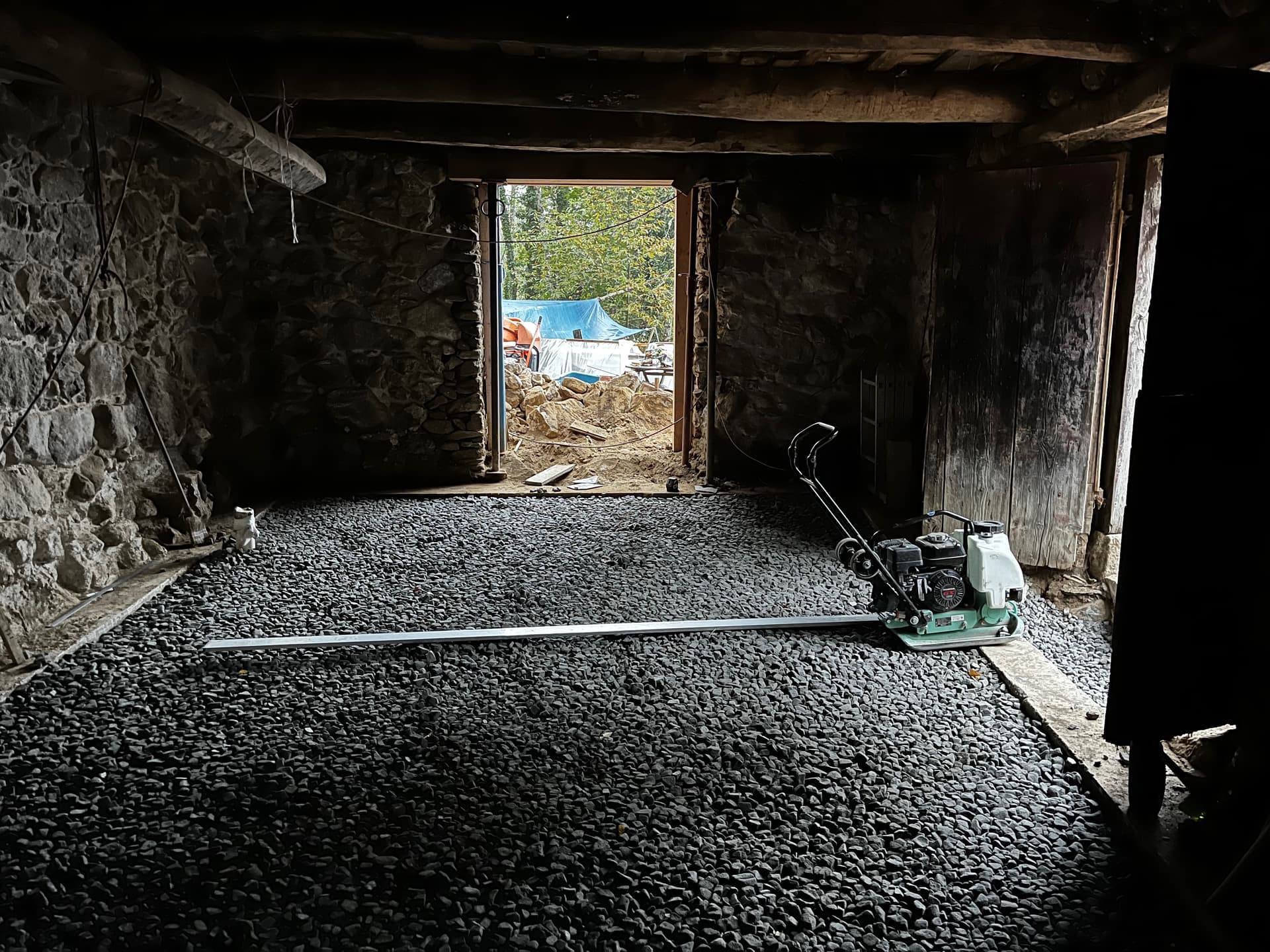 Cet été, on a décaissé la grange de 45 cm sous le niveau 0, qu’on a fixé au seuil de la porte existante. Je vous dis pas les monstres-pierres qu’on a sorti !