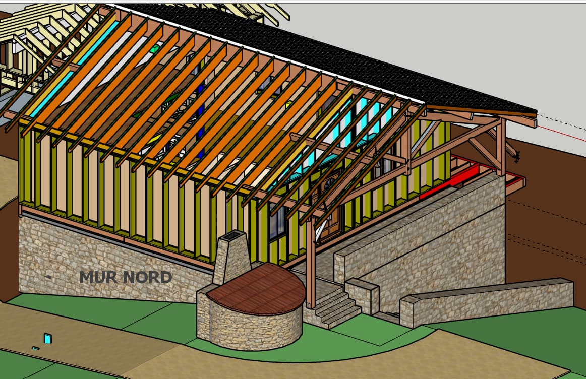 Nous construisons une maison à étage en ossature bois, mais avec un peu de bati en pierre existant : deux murs en pierre, dont un semi enterré au Nord, et une terrasse couverte à l’Ouest.