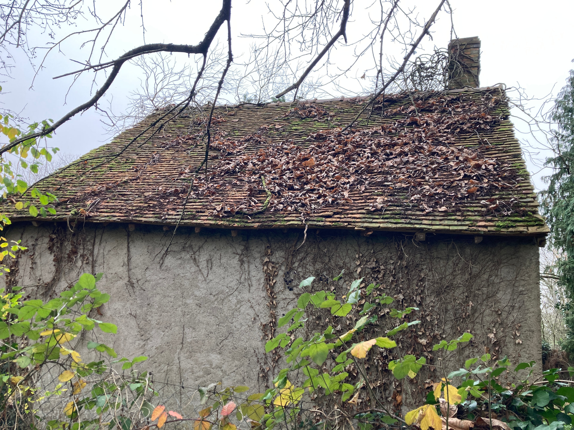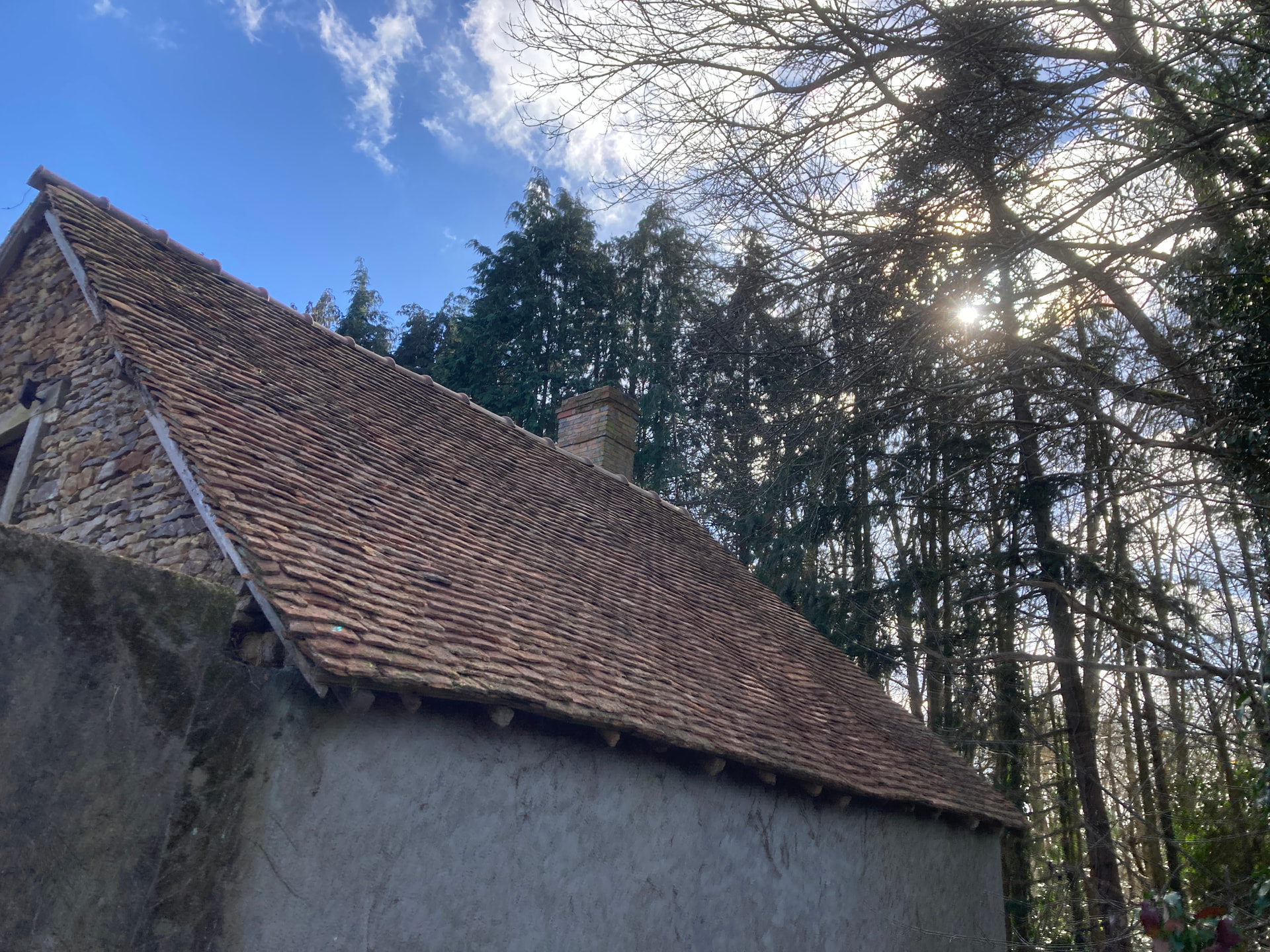 Dépose de la toiture pour remplacement des chevrons, pose d’un écran sous toiture, puis repose des liteaux et des tuiles plates.