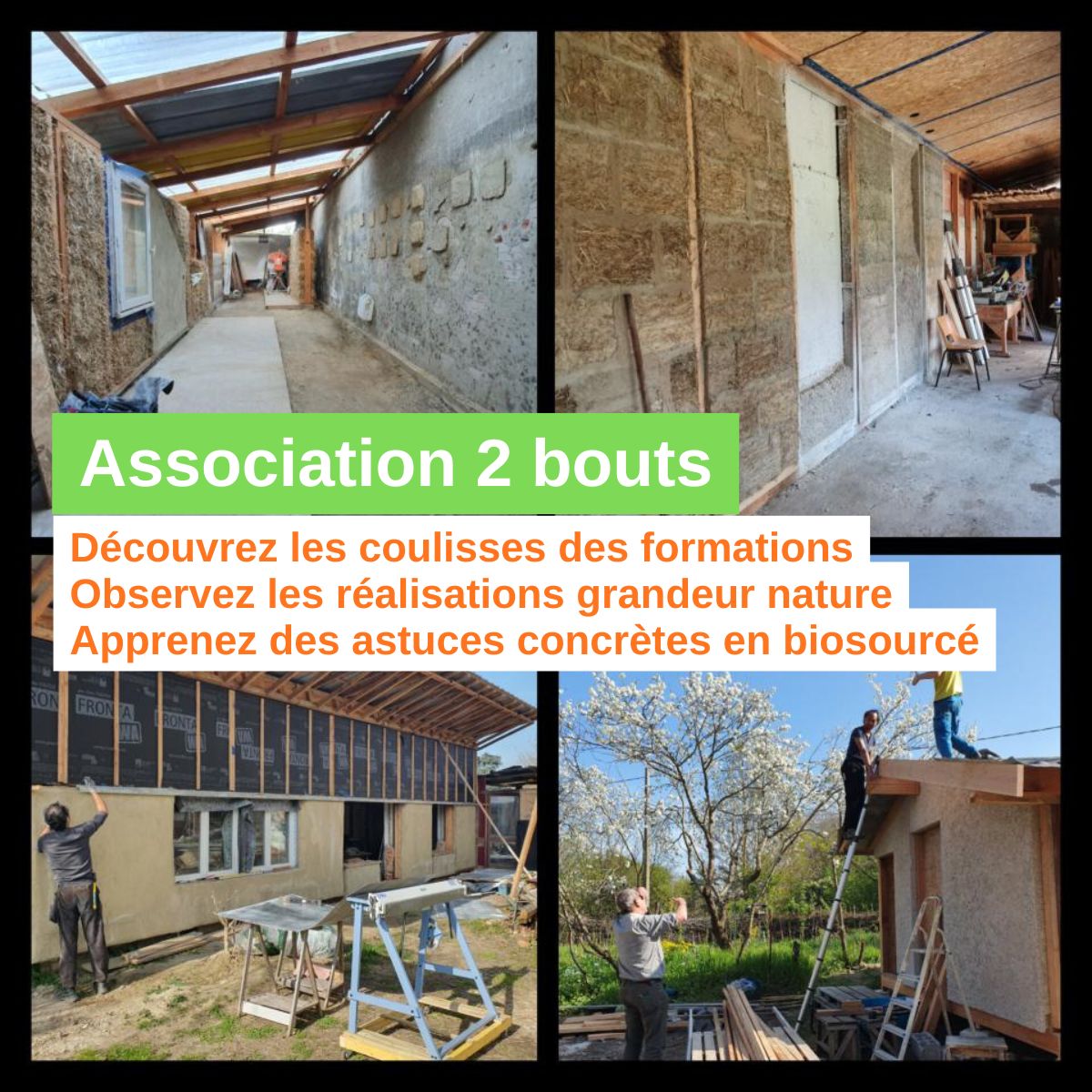 Engagée face aux défis environnementaux actuels — changement climatique, transition énergétique, solidarité — 2bouts déploie des actions concrètes pour accompagner la transition écologique. L’association propose des solutions innovantes en matière de sensibilisation, d’initiation et de formation, en mettant l’accent sur l’habitat écologique : construction durable, énergies alternatives, matériaux biosourcés et géosourcés, ainsi que le réemploi.