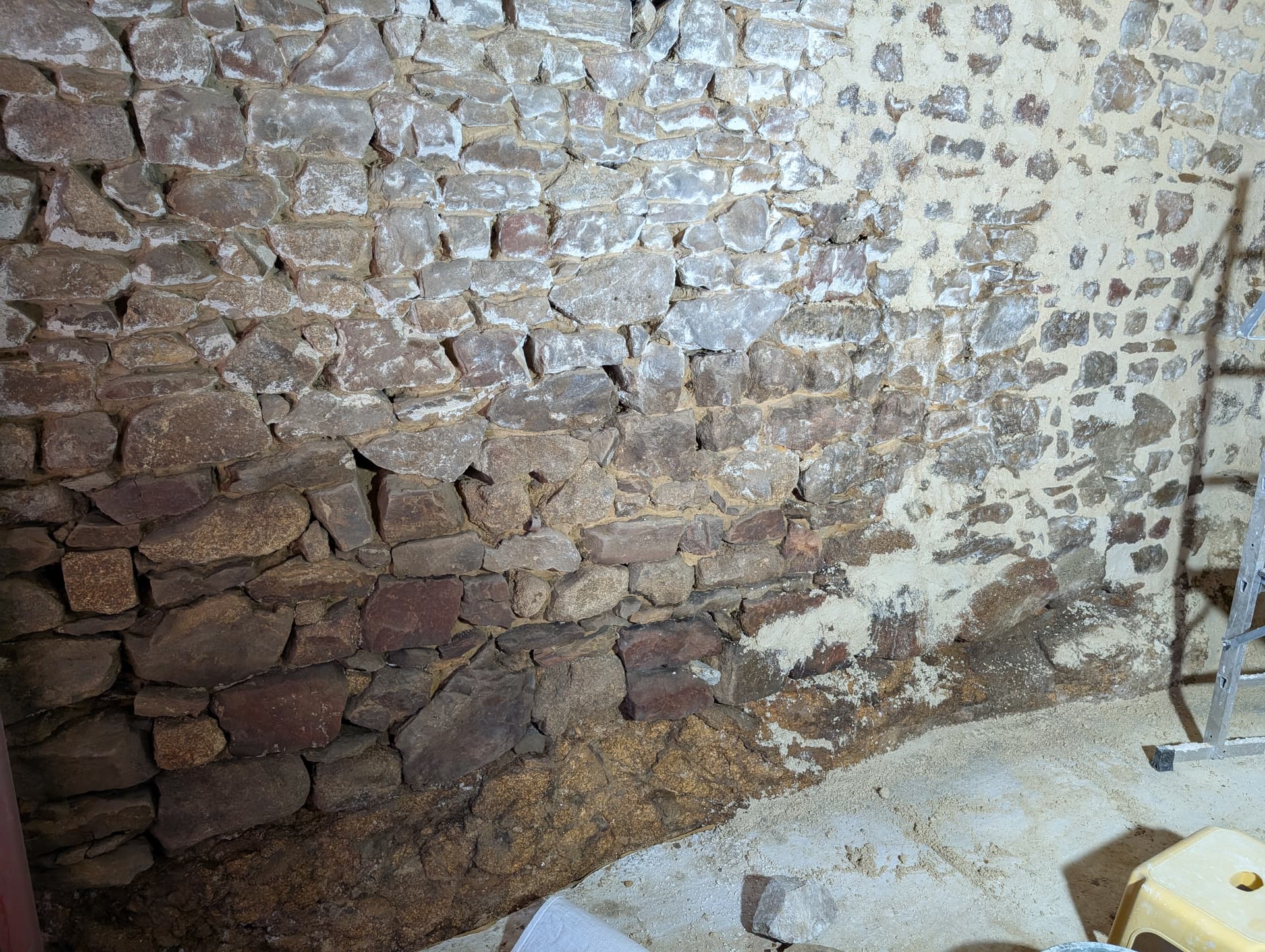 j’aimerais reboucher ces trous en procédant de la manière suivante : nettoyer toute la poussière, mouillé à deux ou trois reprises, puis mettre un premier lit de mortier, puis des pierres au dessus, jusqu’à reboucher ce trou. Comme mortier je pense utiliser un mélange chaux NHL 3.5, sable 0-4 en proportion classique 1/3. Est-ce que cette procédure vous semble correcte (les pierres seront nettoyées au Karcher, toutes ne sont pas propres) ?