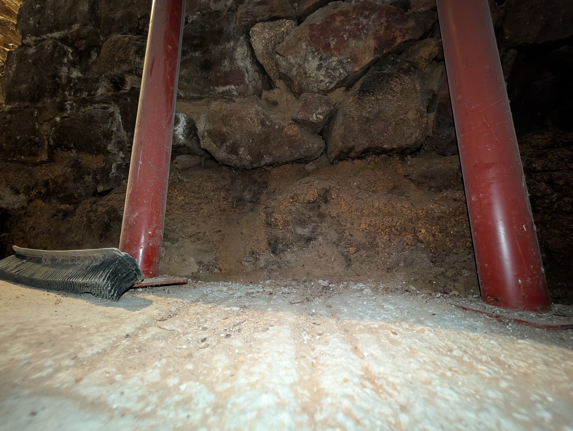 Le sol a du être retiré au niveau de ce mur nord il y a 40, 60 ans (ou plus ?) ce qui fait que le soubassement est visible et a même été abimé avec le retrait de l’assise de la première pierre du mur