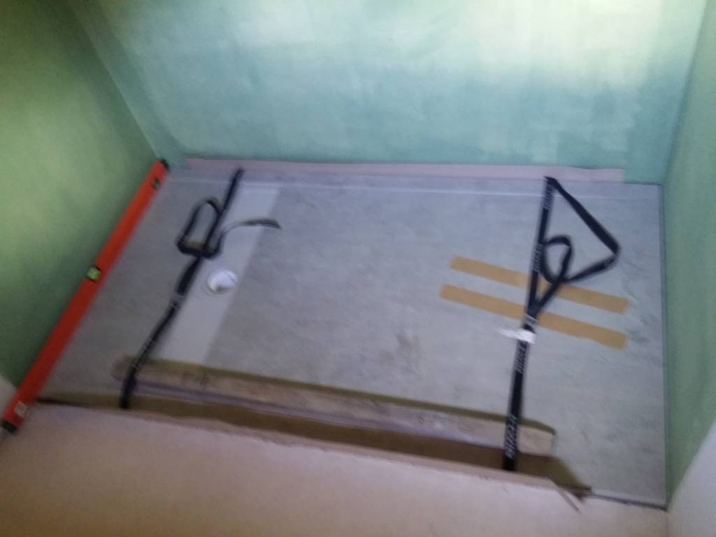 Placement du receveur (collé sur la chape). Gros stress vus le poids de la bête (95kg) et son prix !