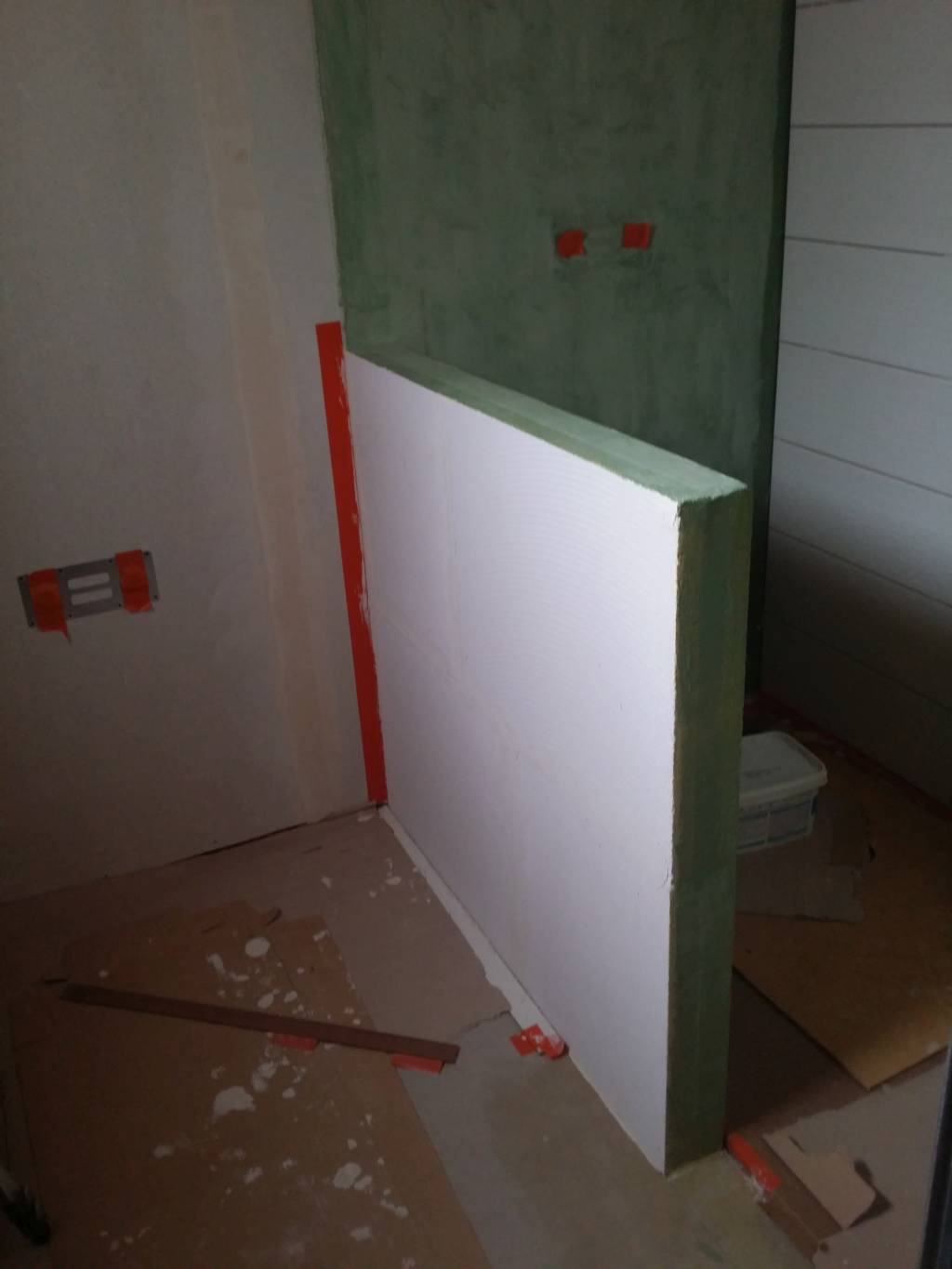Me voici arrivé à l’étape de faire une salle de bains, à l’intérieur des cloisons que j’ai réalisées en fermacell. Et blam, grosse erreur, (encore une…) je consulte après coup la doc fermacell qui indique que les plaques standard fibre-gypse ne SONT PAS compatibles pour une douche (ils vendent les plaques powerpanel H20 pour ça). Damned.