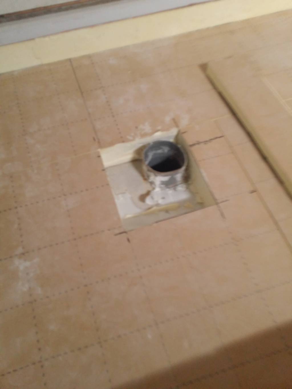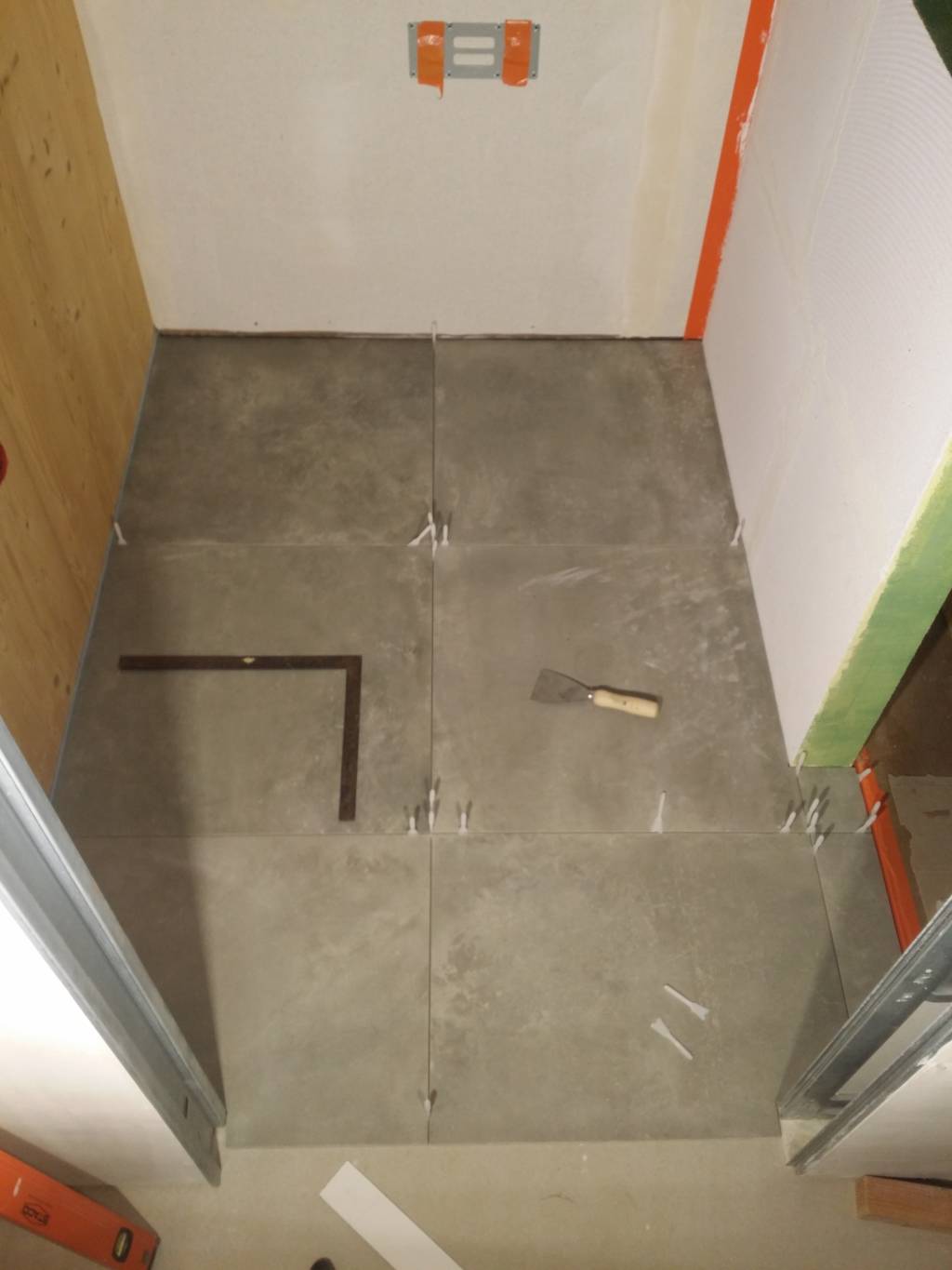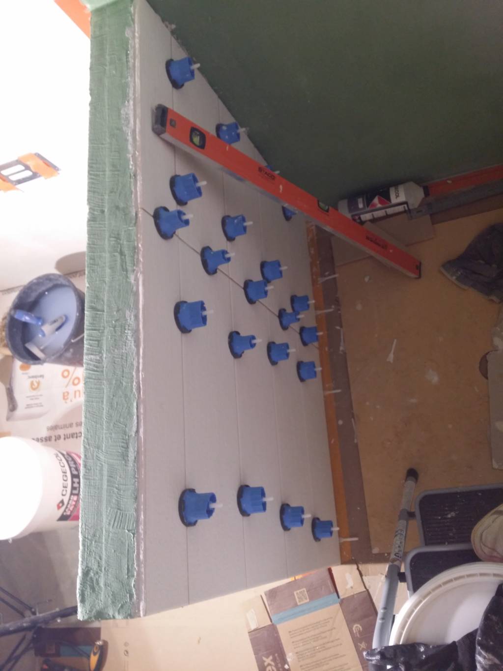 Pose du carrelage au sol. Au final “léger” raté, mon receveur est 2mm au-dessus du niveau du carrelage.