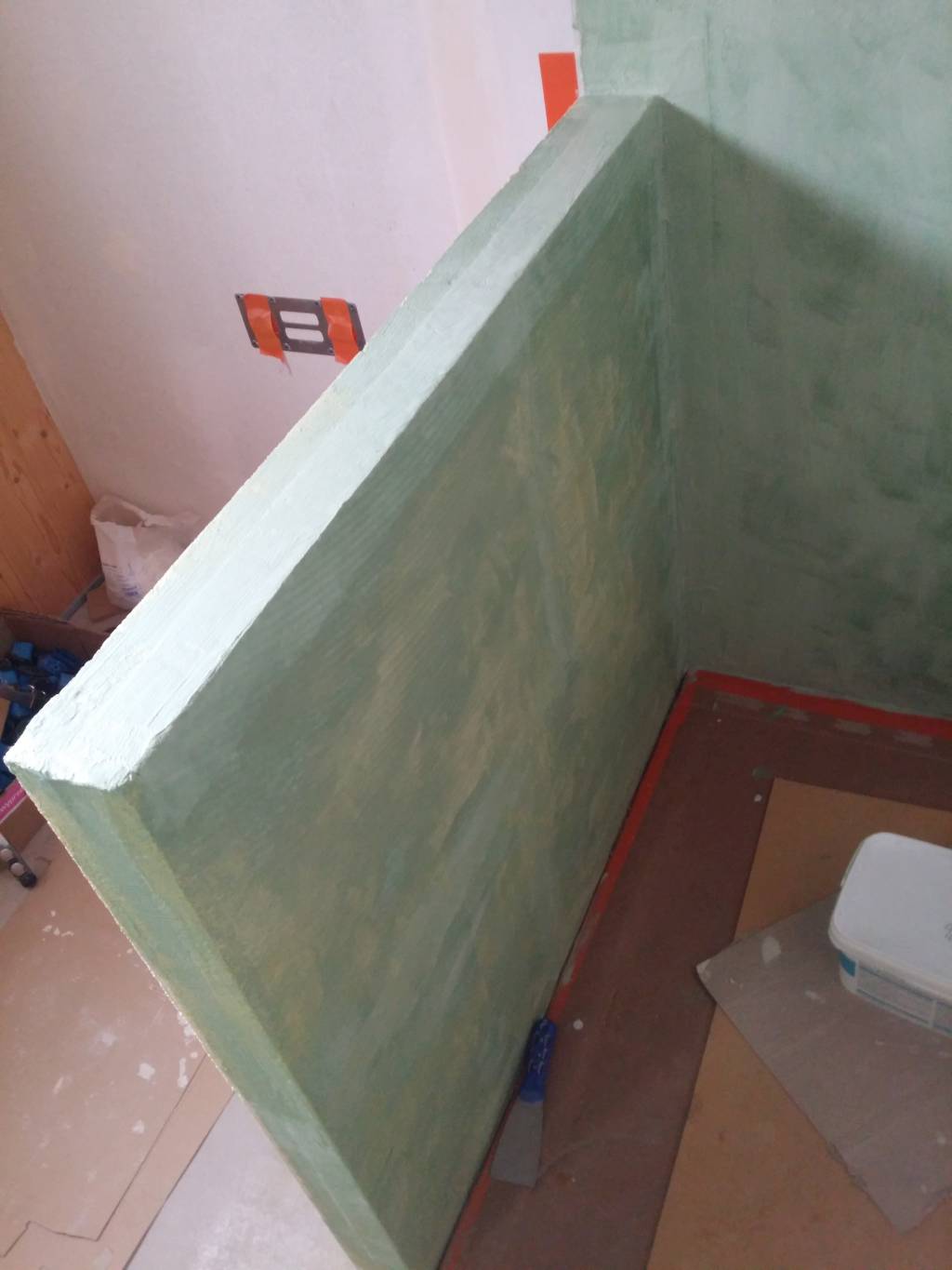 Trop tard, c’est fait. La cabine est fermée en fermacell sur 3 côtés. Je dois maintenant étanchéifier tout ce bazar, SANS REDUIRE l’espace car il est calculé au poil de nombril pour accueillir le receveur céramique qui n’est pas rabotable… Je précise que la finition sera carrelée.