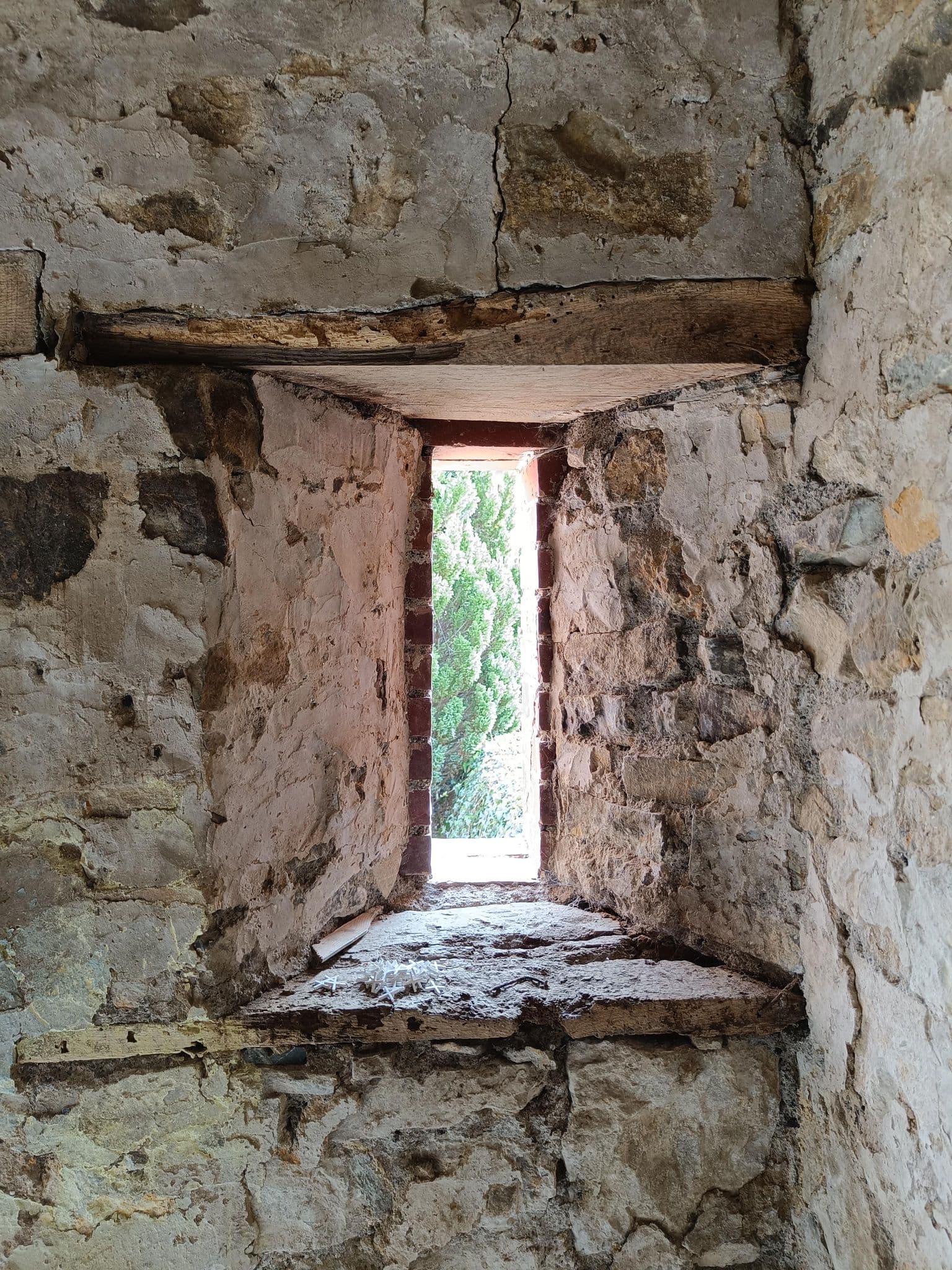 Les meurtrières comportent un rebord car les tableaux extérieurs sont en briques et les tablettes côté intérieur sont légèrement plus basses (nous allons refaire celles-ci en chaux car les anciennes en bois étaient abîmées et partiellement remplacées avec du plâtre).