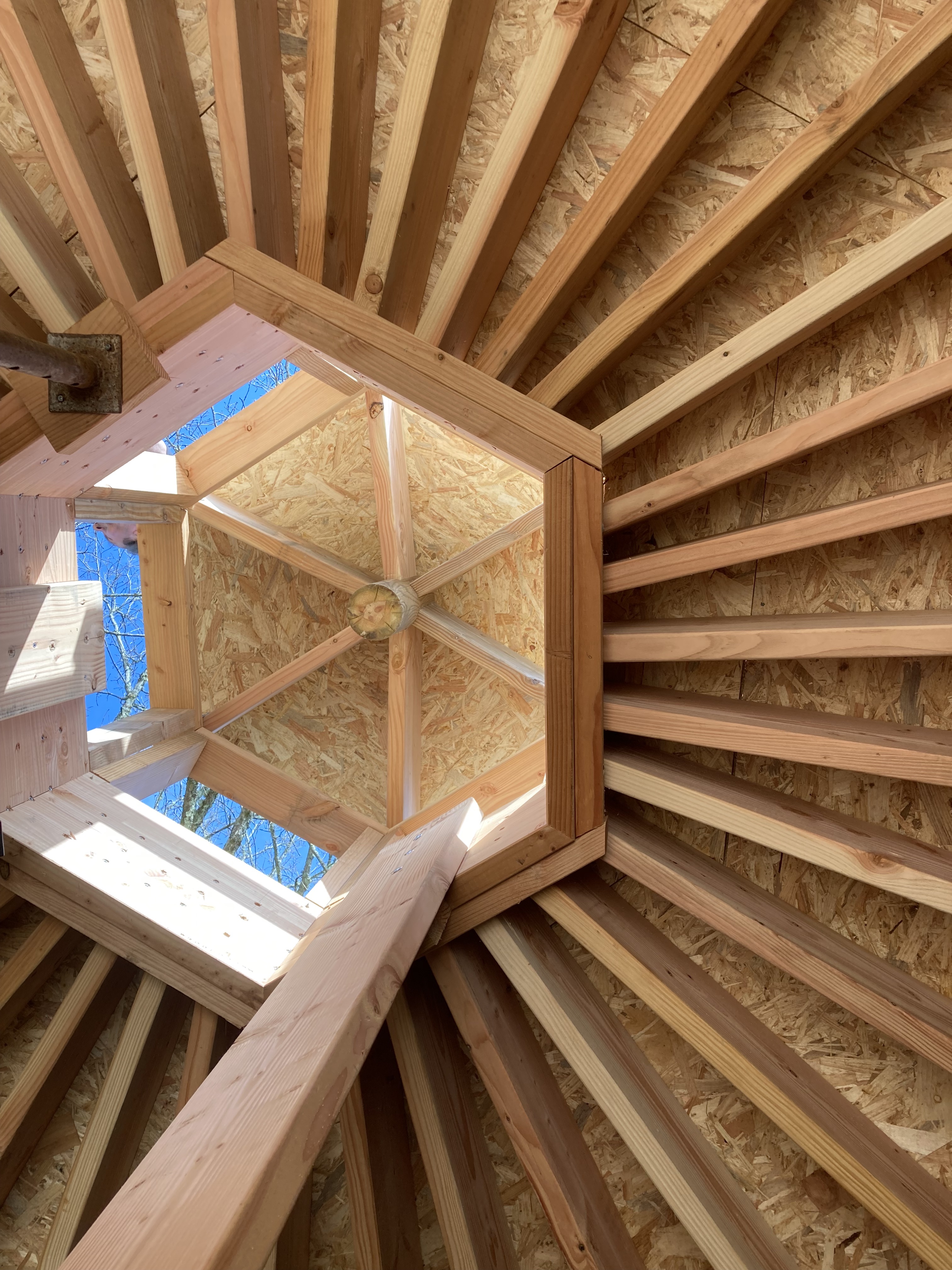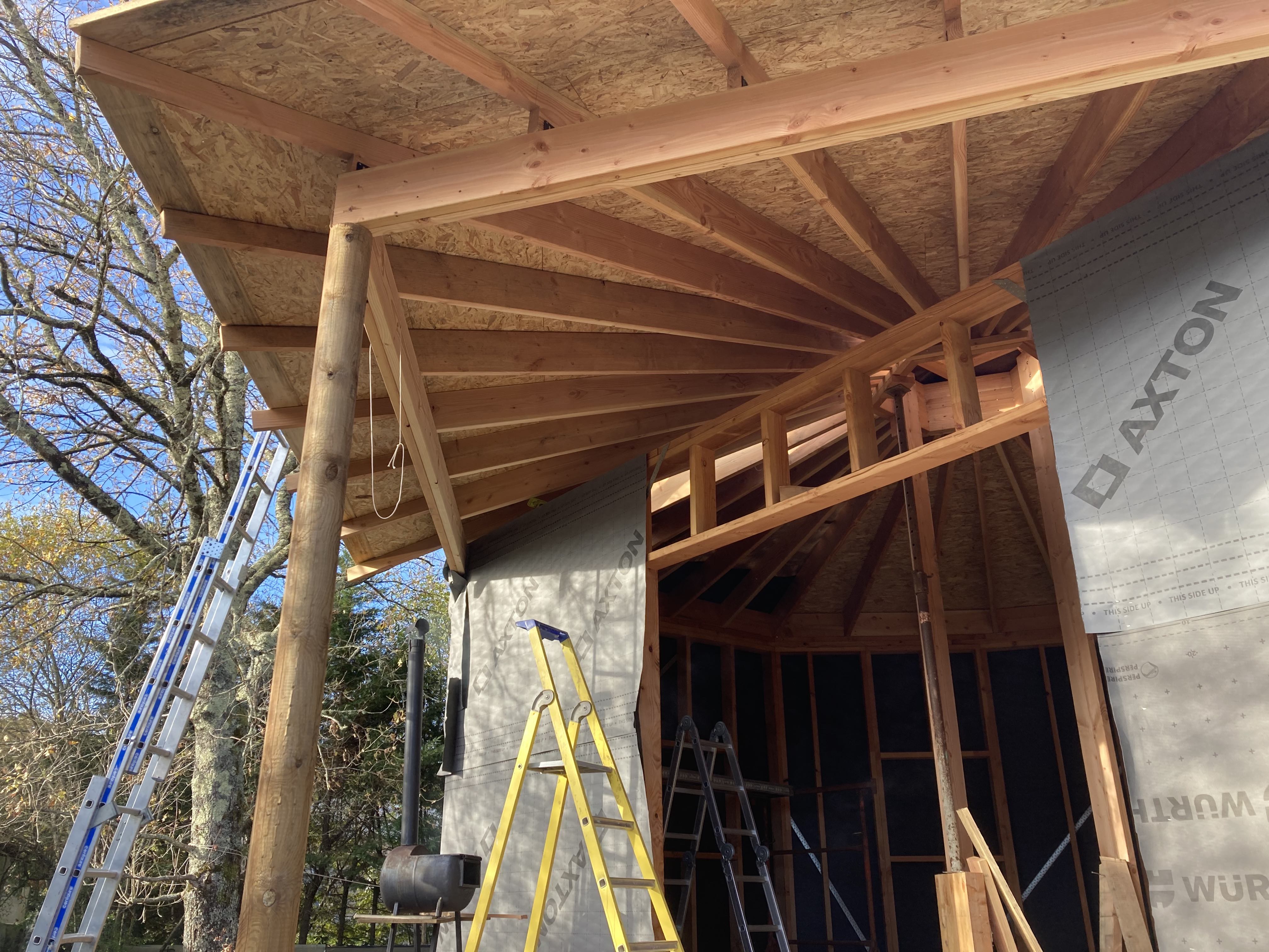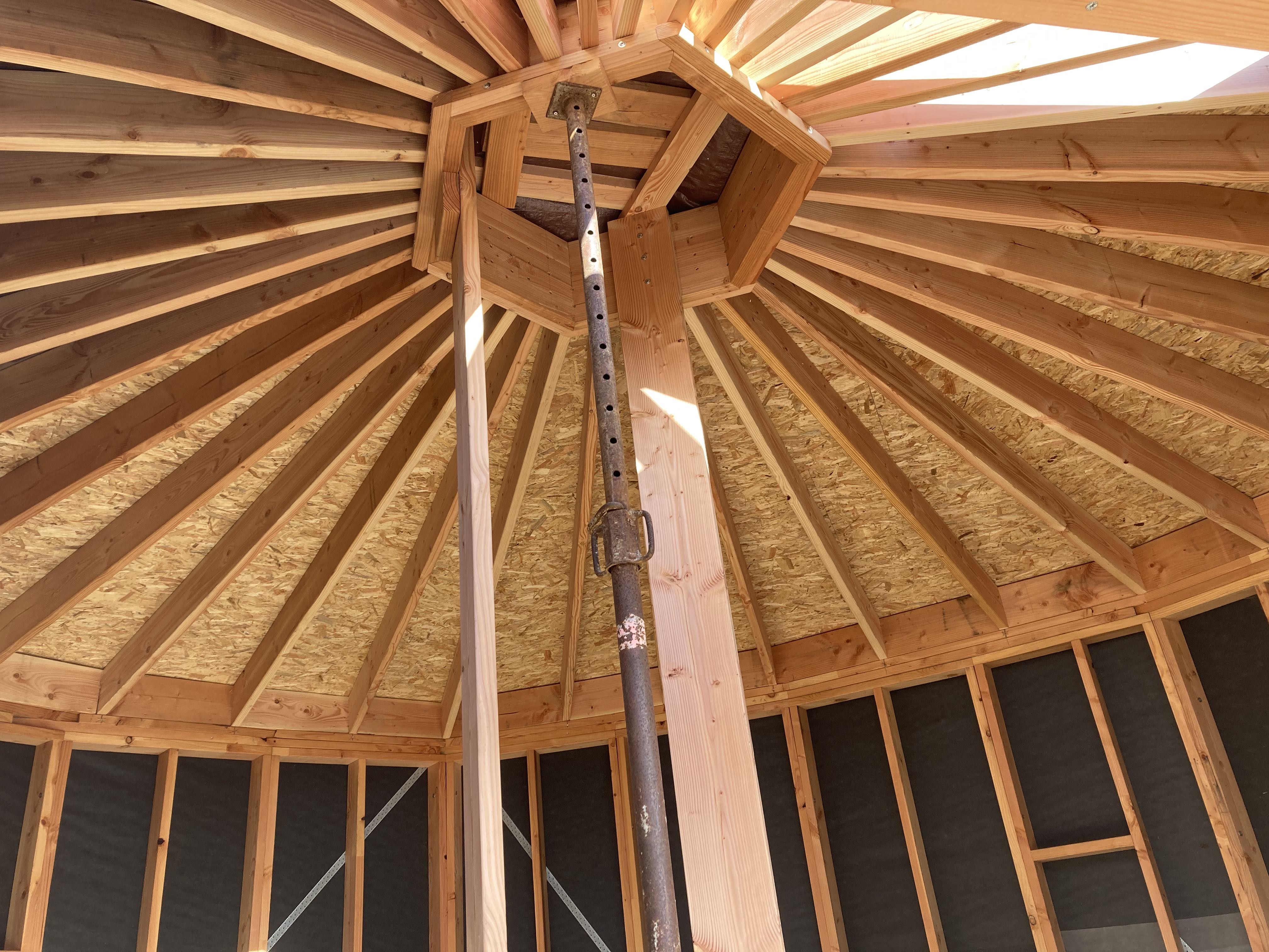 L’ossature bois est en place et la maison est hors d’eau. Nous mettons en œuvre plusieurs techniques de construction en paille et en terre, en privilégiant au maximum le réemploi. Le projet intègre aussi toilettes sèches, récupération des eaux pluviales, pédoépuration, énergie solaire et poêle à bois.