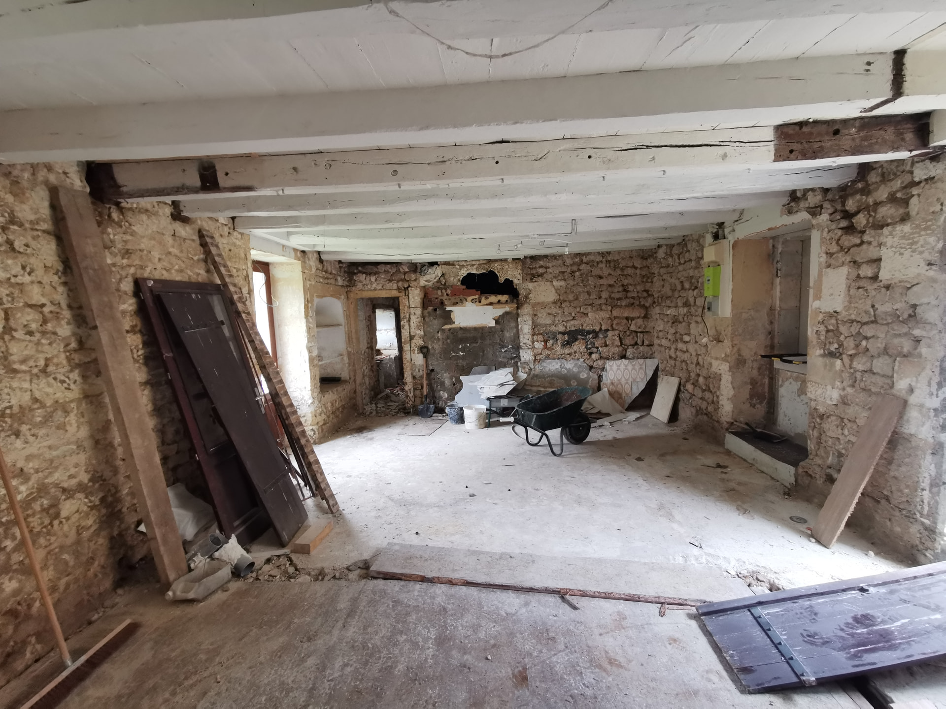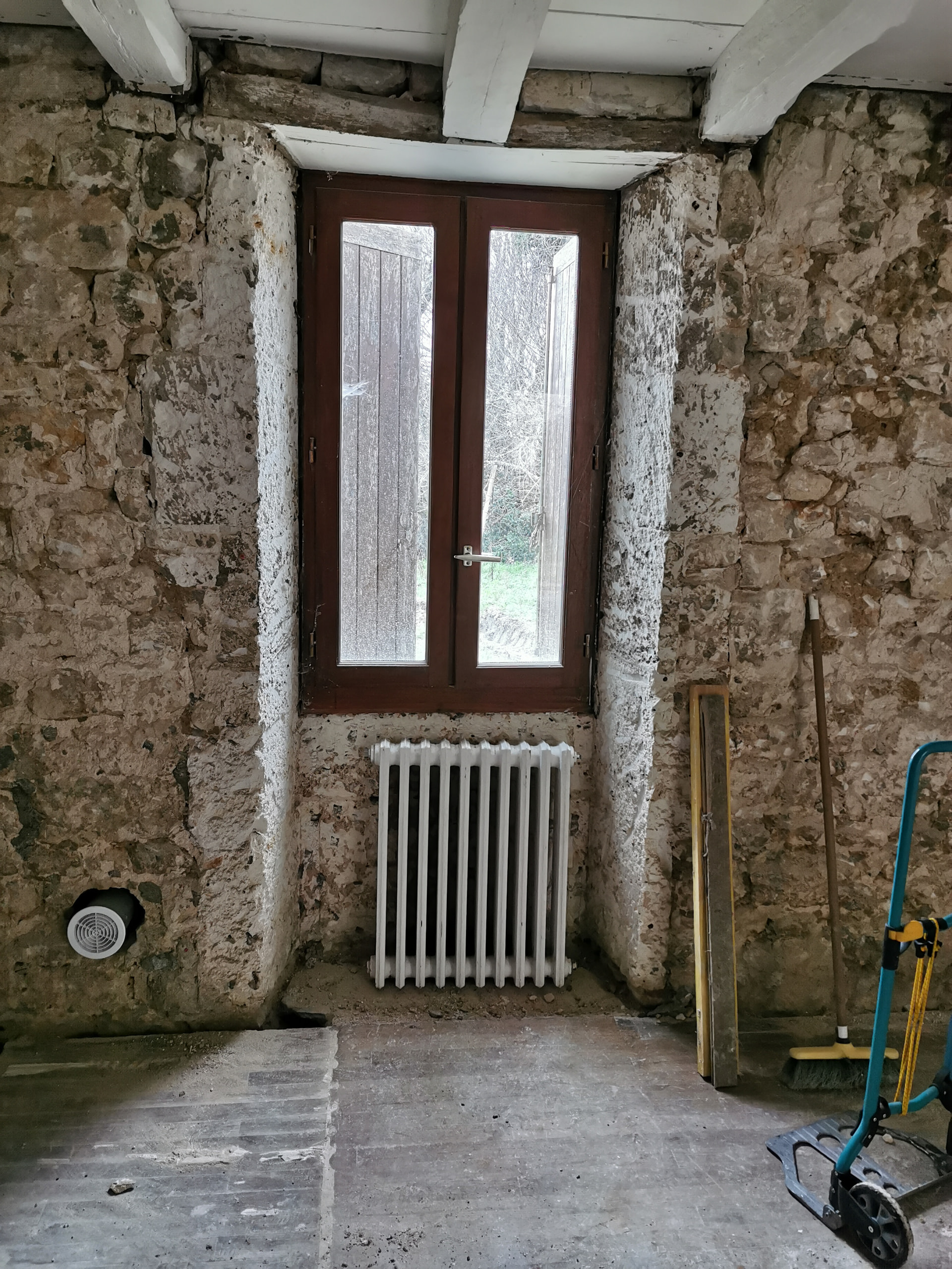 J’ai donc piqué tous les anciens enduits pour retrouver la pierre à nu. Ma stratégie est de travailler la perspirance au niveau des murs avec un enduit chaux/chanvre et ainsi faire une correction thermique.