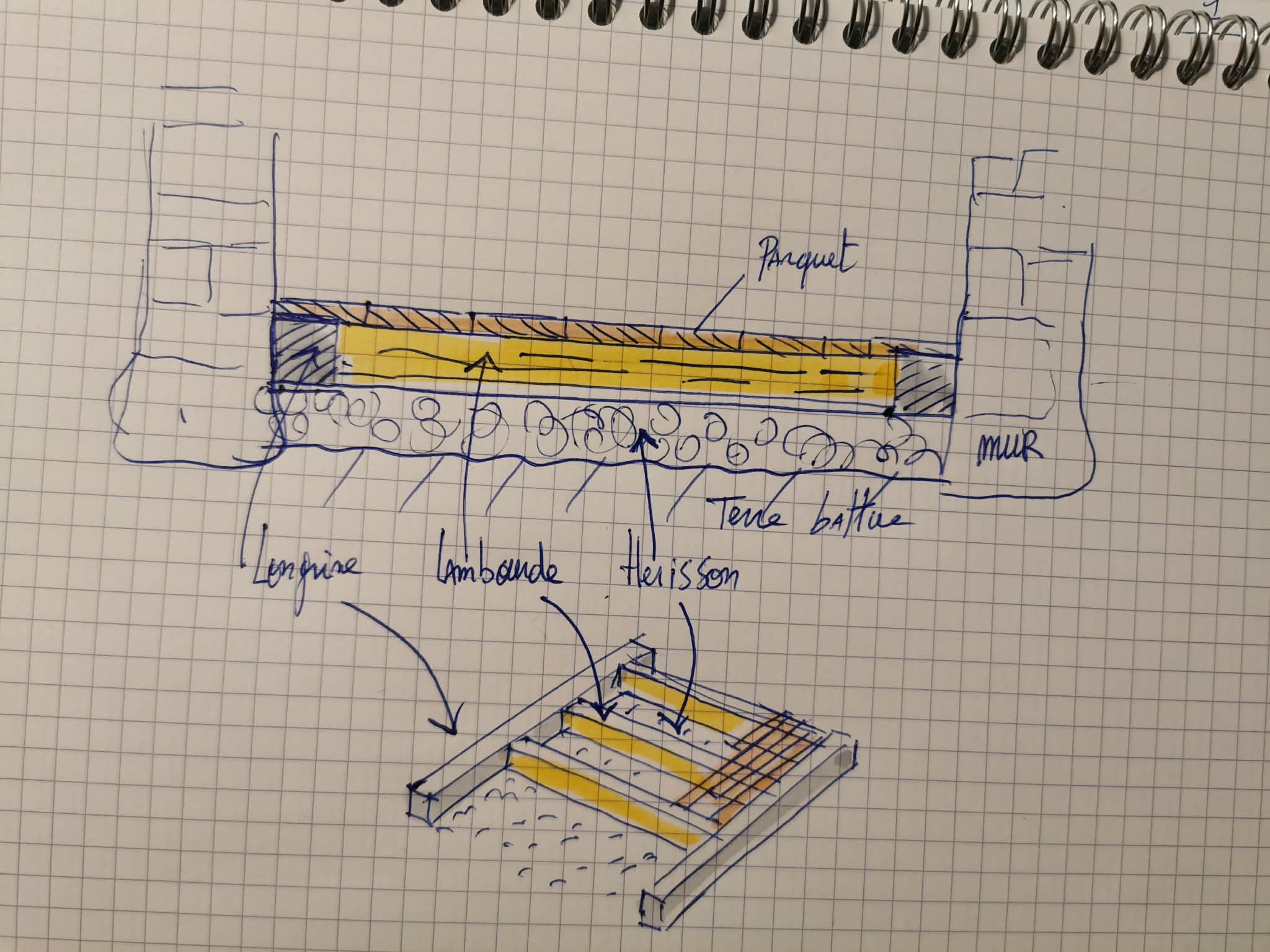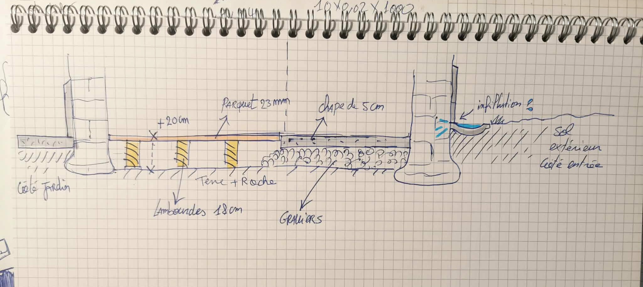 J’hésite vraiment à faire une petite dalle en ciment de 10 cm voire moins sur du gravier et des galets de 10 à 15 cm (pas vraiment un hérisson digne de ce nom et pas ventilé) juste désolidarisé de mes murs de 5 cm en périphérie ( pour laisser mes murs respirer) et repartir avec mon parquet sur lambourde. Ou faire la même chose avec de la chaux, tant qu’à faire…je ne sais pas…je n’ai jamais vu de petite épaisseur dalle de chaux sur du gravier, je suis un peu dans le flou.