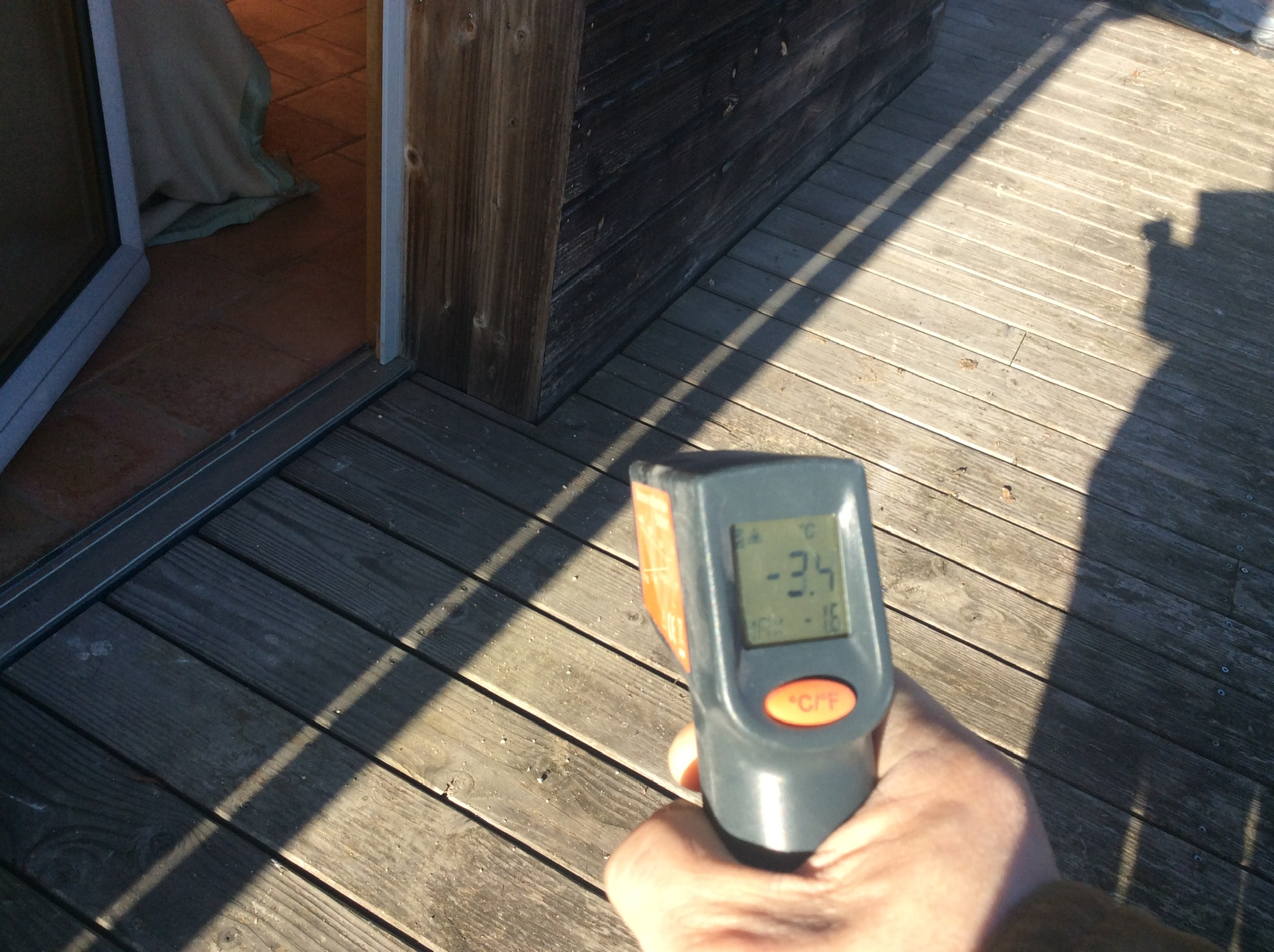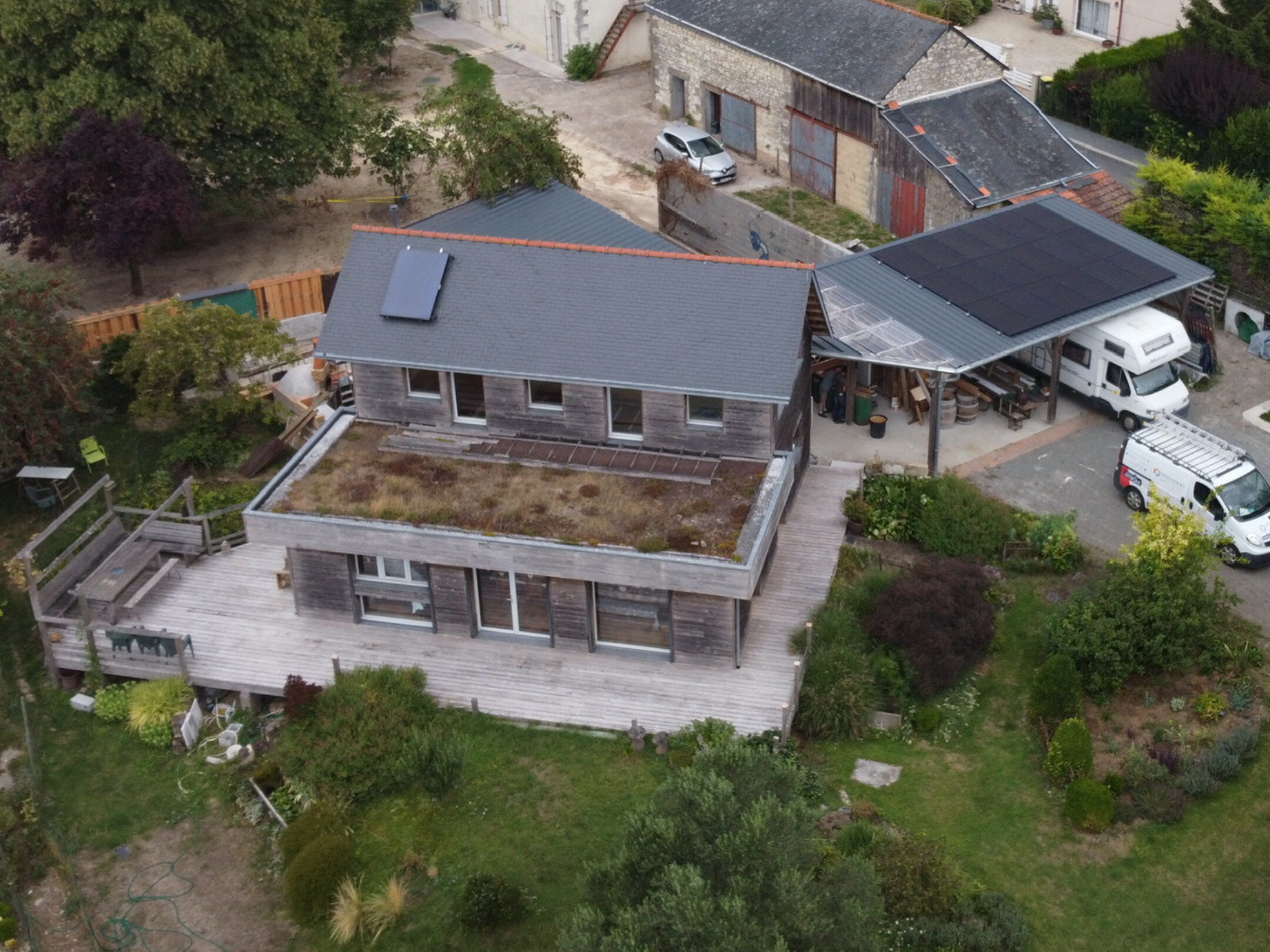 Au sol, des tommettes de récupération côtoient du parquet. L’électricité passe par des gaines flexaraie, et une casquette solaire protège la maison. La terrasse est végétalisée, et nous récupérons l’eau de pluie pour alimenter les toilettes en hiver.