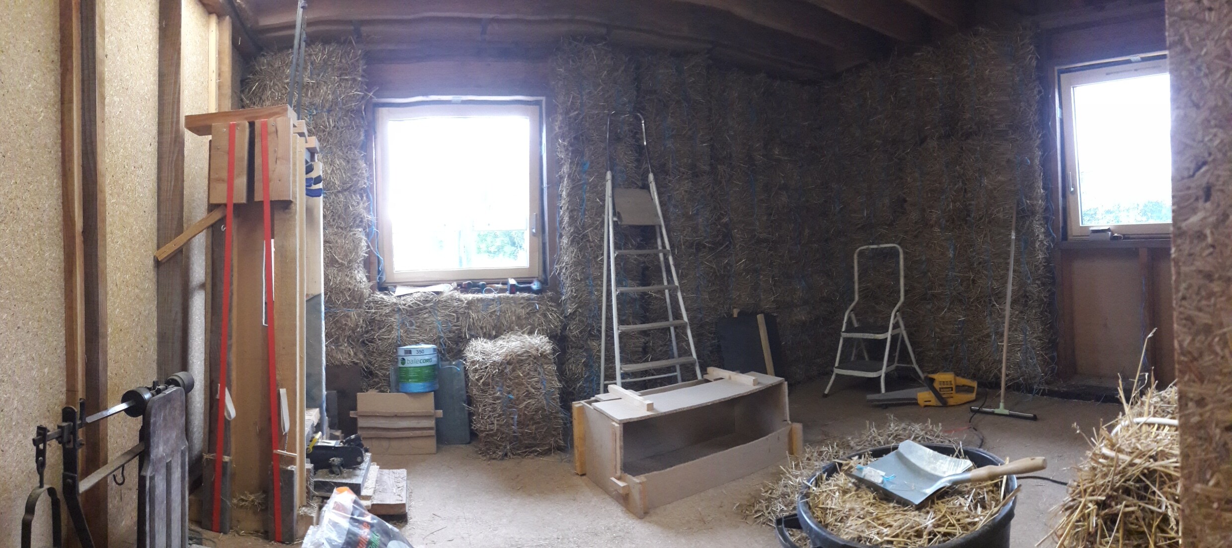 La maison repose sur un vide sanitaire en parpaings et une dalle bois. Toute la structure est en pin Douglas. Ce printemps, elle est hors d’eau / hors d’air, la paille est insérée dans l’ossature (avec un peu de laine de bois dans certains murs). À l’extérieur, on avance sur le bardage, et à l’intérieur je m’apprête à attaquer les réseaux électriques et de plomberie. Viendra ensuite le temps de l’enduit terre crue sur la paille.