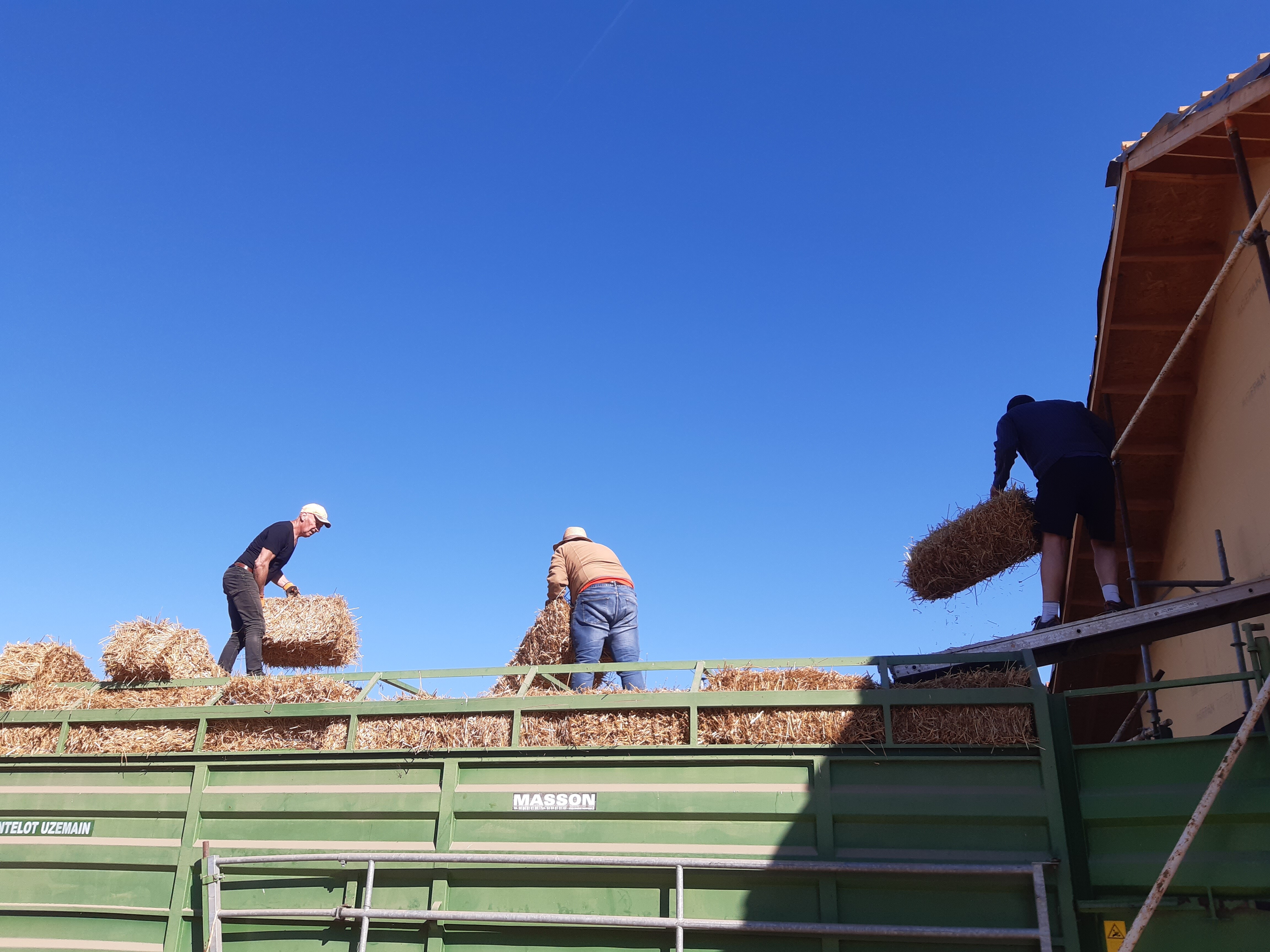 Construction paille — Isolation en bottes de paille insérées dans l’ossature bois, enduit terre crue