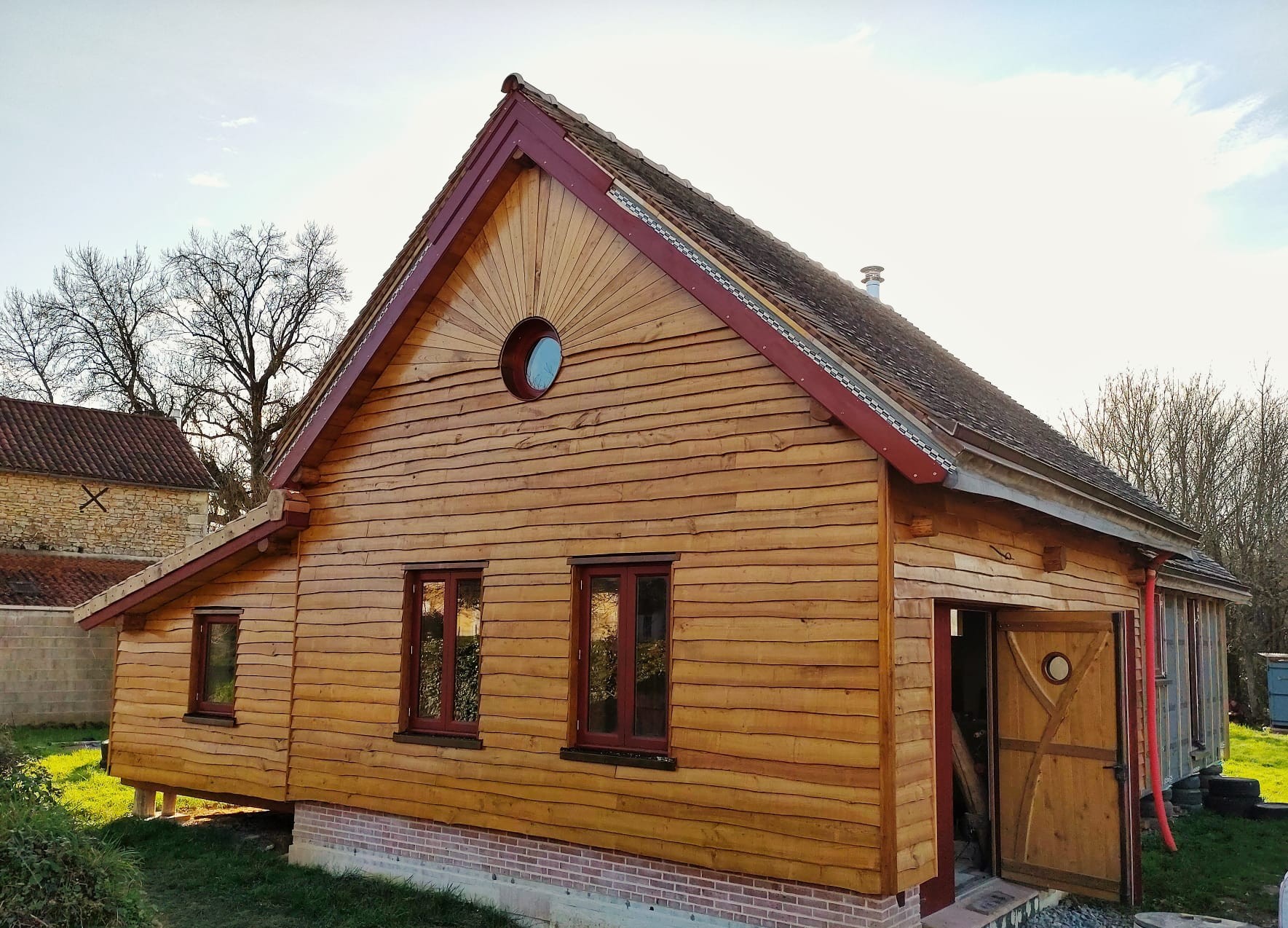 La moitié de la maison est une charpente en bois rond faite sur place, l’autre en bois de brin équarri à la hache et taillée en atelier. Les murs sont isolés en bottes de paille, la couverture est presque exclusivement constituée de 6000 bardeaux fendus en châtaignier. Nous avons privilégié les matériaux locaux et les techniques artisanales traditionnelles, dans la continuité de mon parcours d’ébéniste et charpentier.