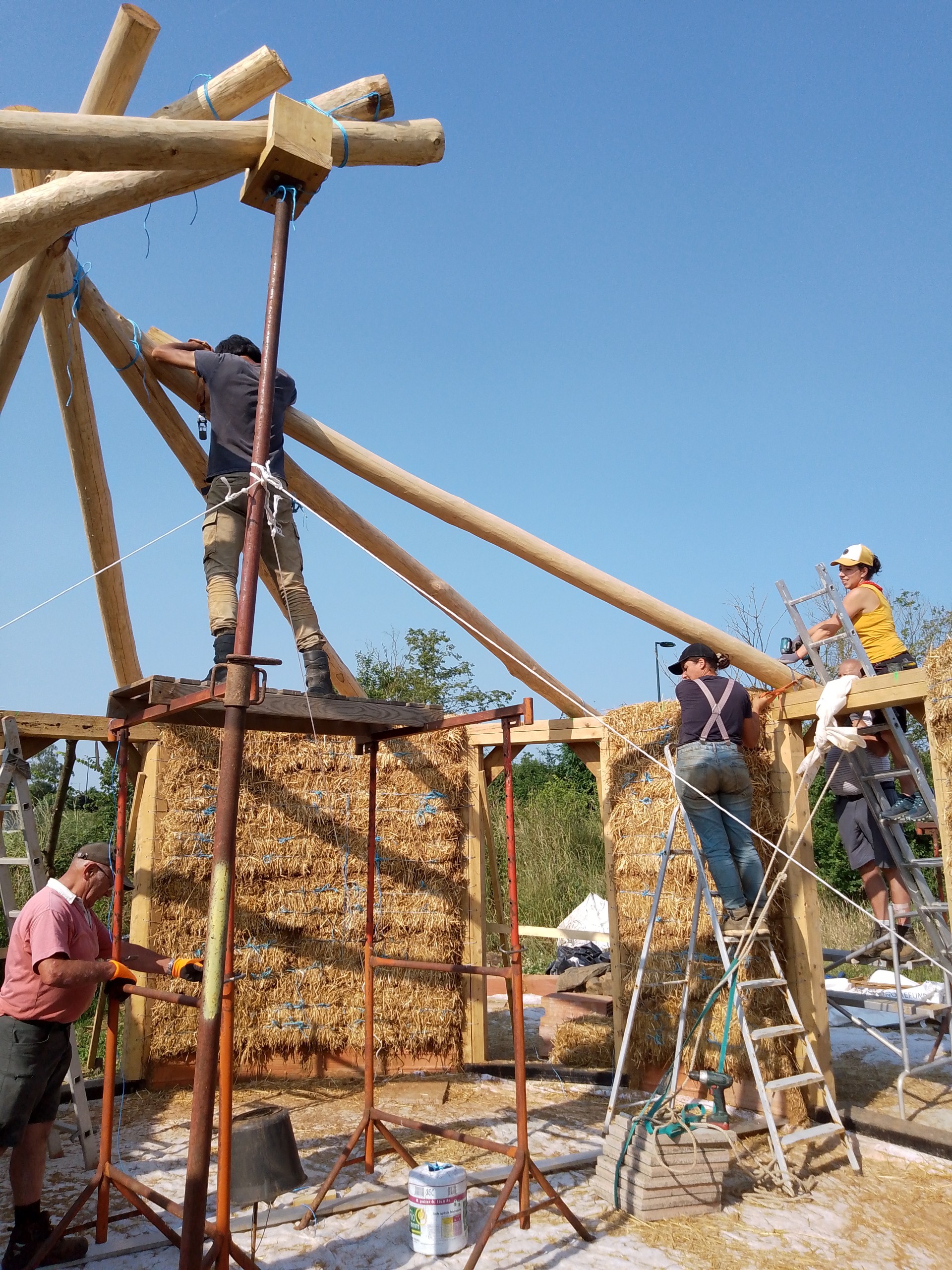 Je vous accueille dans ma paillourte en cours de construction à Antigny, en Vendée. Ce projet associe plusieurs techniques qui me tiennent à cœur : des murs en paille porteuse (sans ossature bois), une charpente réciproque, des enduits de terre crue, des fondations type hérisson ventilé et une toiture végétalisée.
