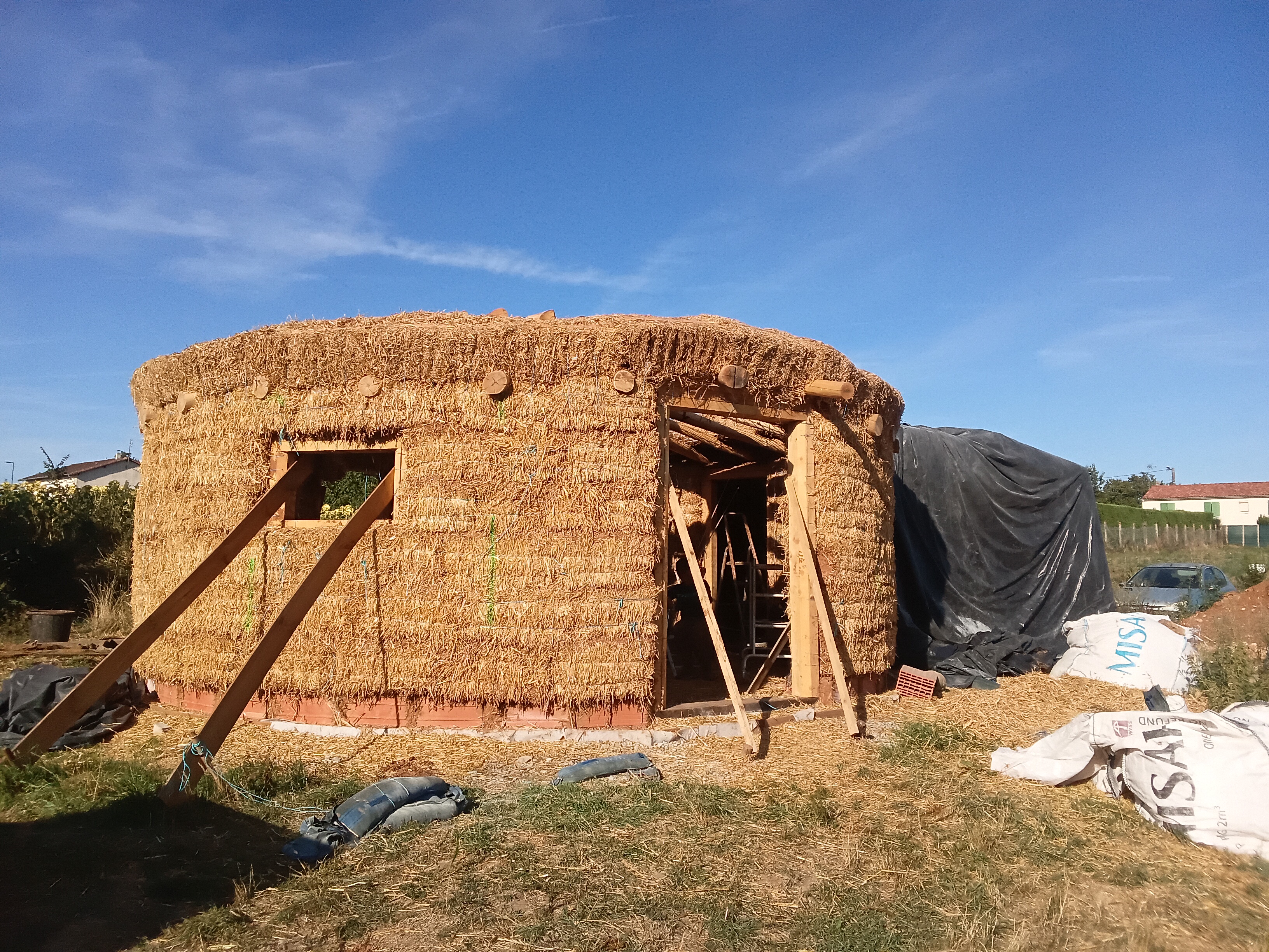 Avant de me lancer l’année dernière, j’ai suivi des formations chez Gurun et au Kerbouzier, puis participé à plusieurs chantiers paillourte via Twiza. Aujourd’hui, le bâtiment est hors d’eau/hors d’air, mais les enduits et la végétalisation de la toiture restent à terminer — ce sera l’aventure de 2026 !