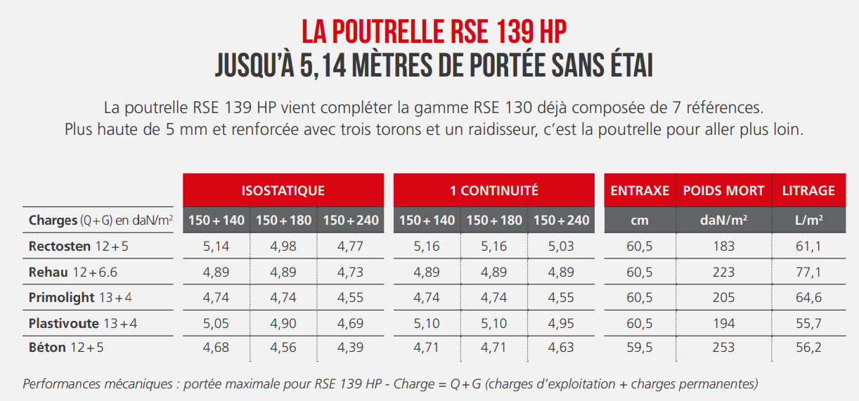 Effectivement, 350kg/m² n’est peut-être pas une information brute facile à exploiter, mais le maçon est dans le bon ordre de grandeur ! La réponse est tout simplement à trouver dans la fiche technique des poutrelles en béton posées sur votre chantier. A priori, la résistance minimale actuellement est 150kg/m² de charge d’exploitation + 140kg/m² de charge permanente.