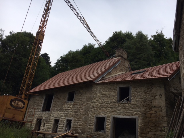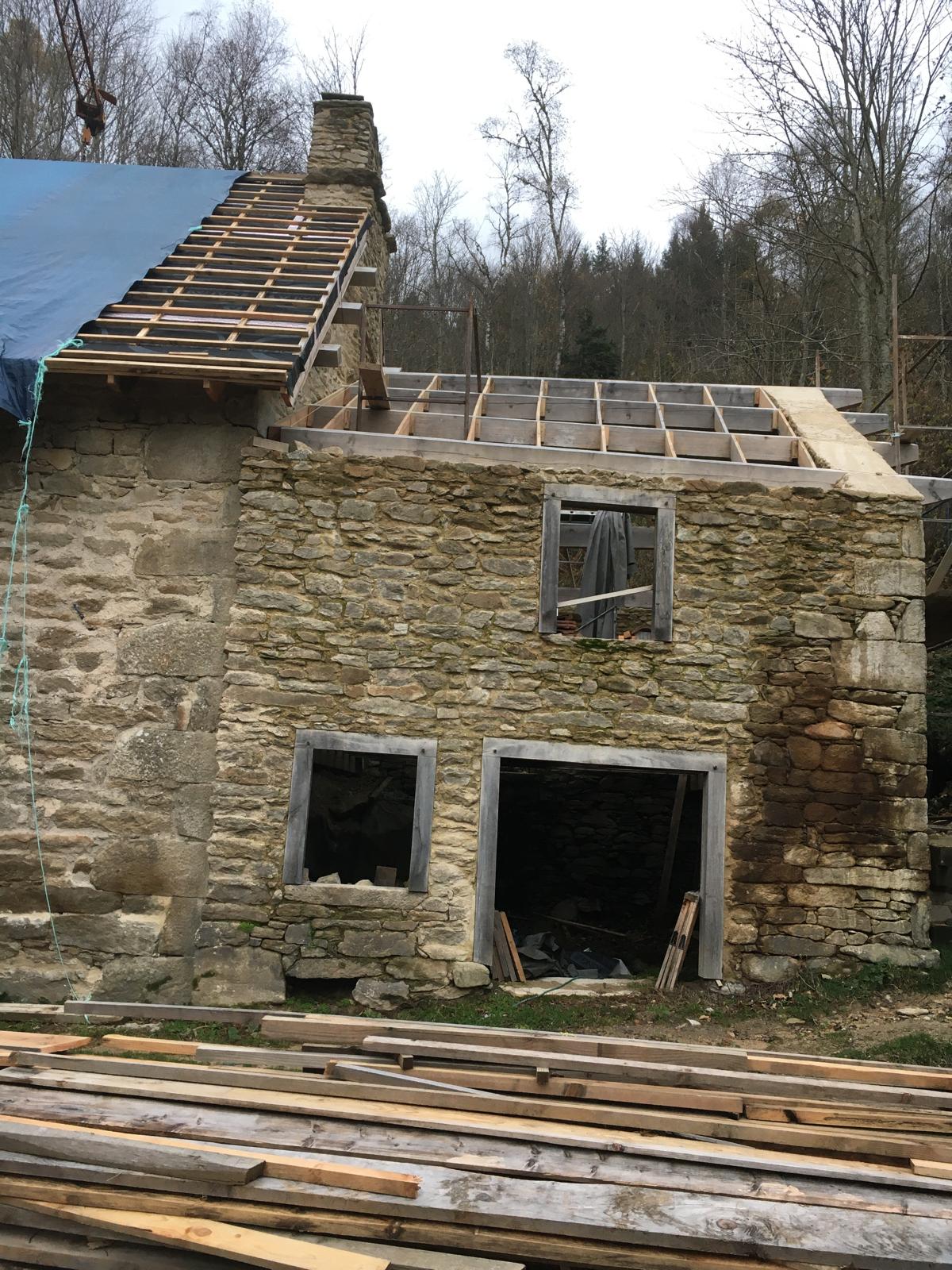 Le premier bâtiment est aujourd’hui entièrement rénové. Nous avons remonté les murs en pierre effondrés, puis réalisé la charpente, l’isolation et la couverture à partir des arbres de notre propriété. Cette année, nous nous lançons dans la rénovation du second bâtiment, en suivant la même démarche.