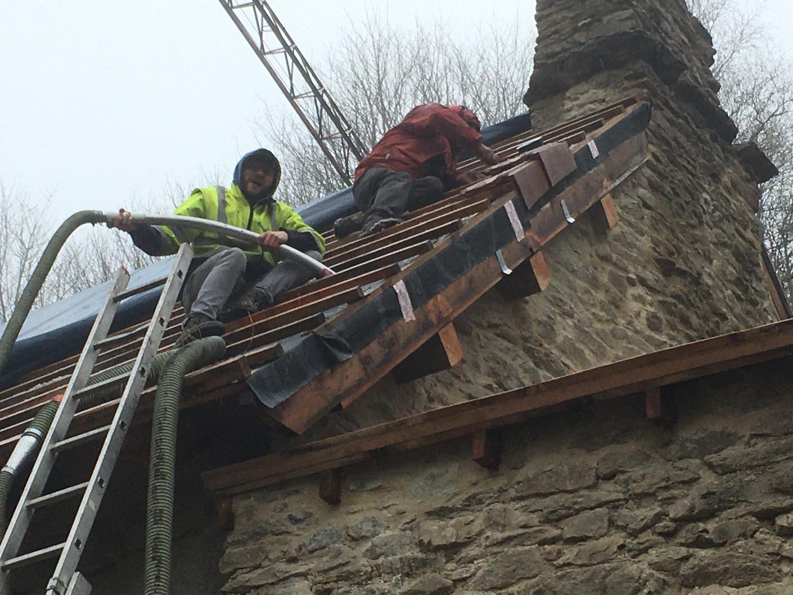 Ce qui rend ce projet singulier ? Notre volonté de respecter au plus près l’architecture et les techniques de construction historiques. Le sable pour le mortier est extrait sur place, le bois est coupé et débité ici même, les encadrements de portes et fenêtres sont réalisés à l’identique de l’existant. Tout est pensé pour préserver l’âme de ces lieux.