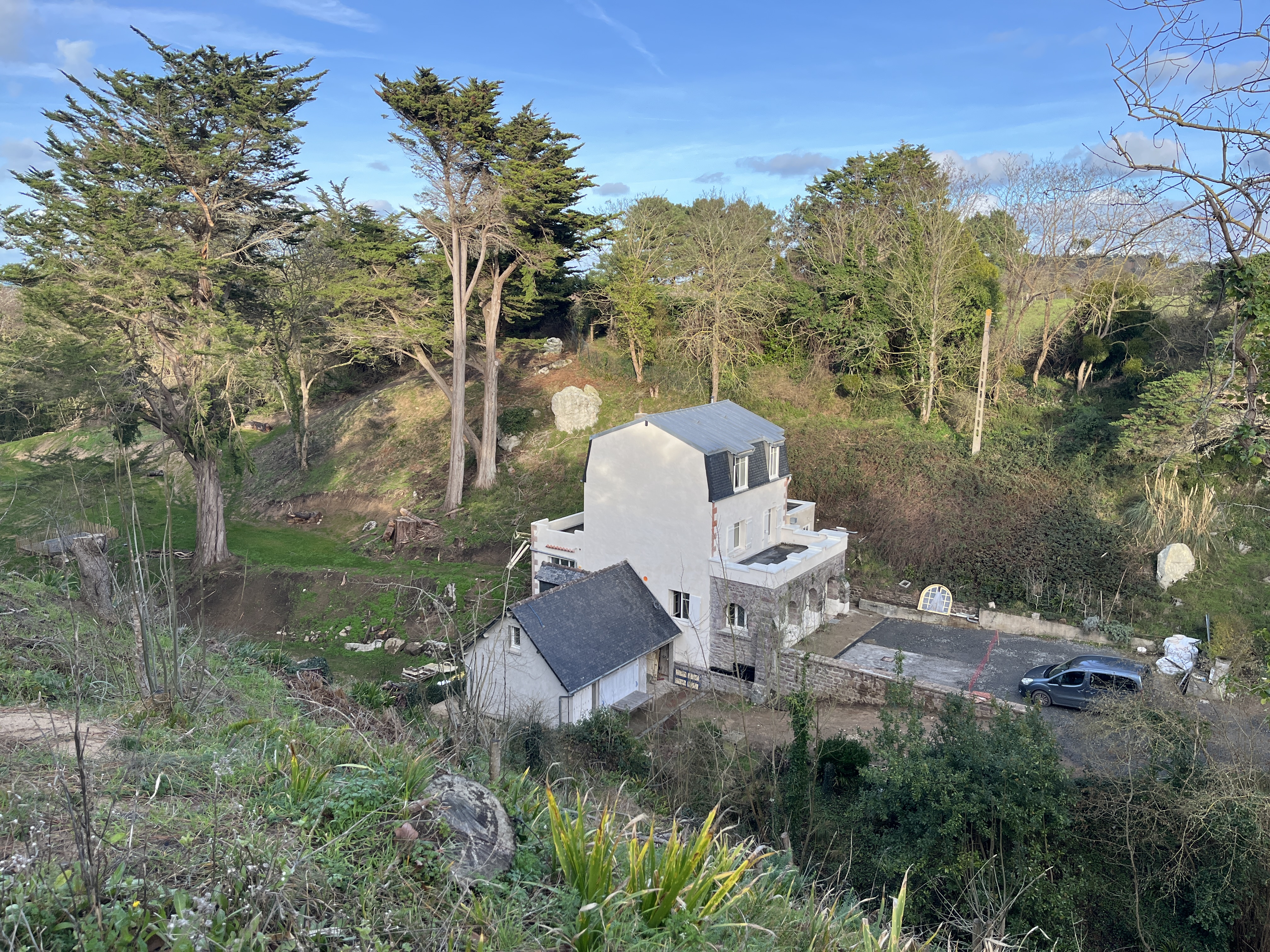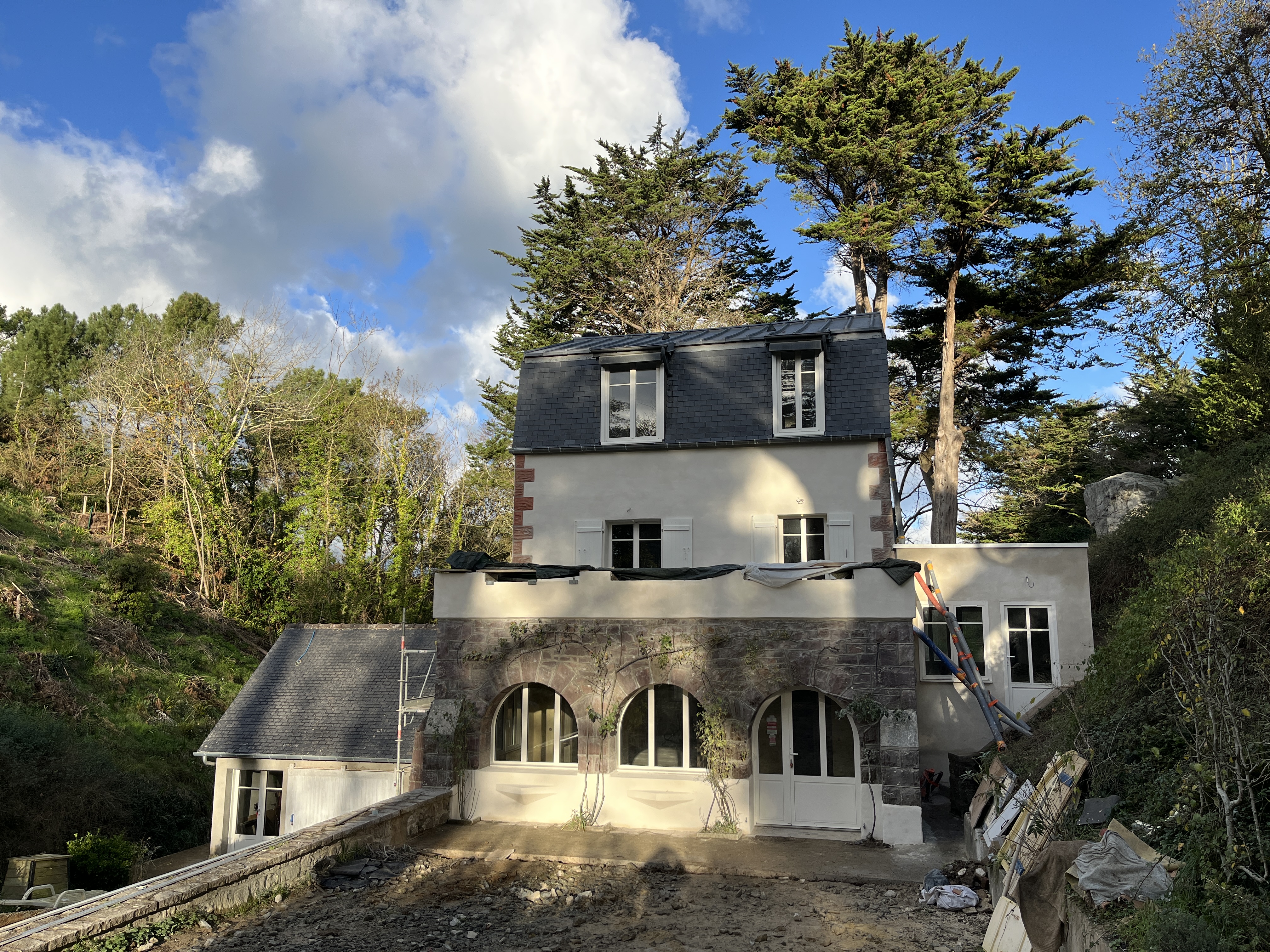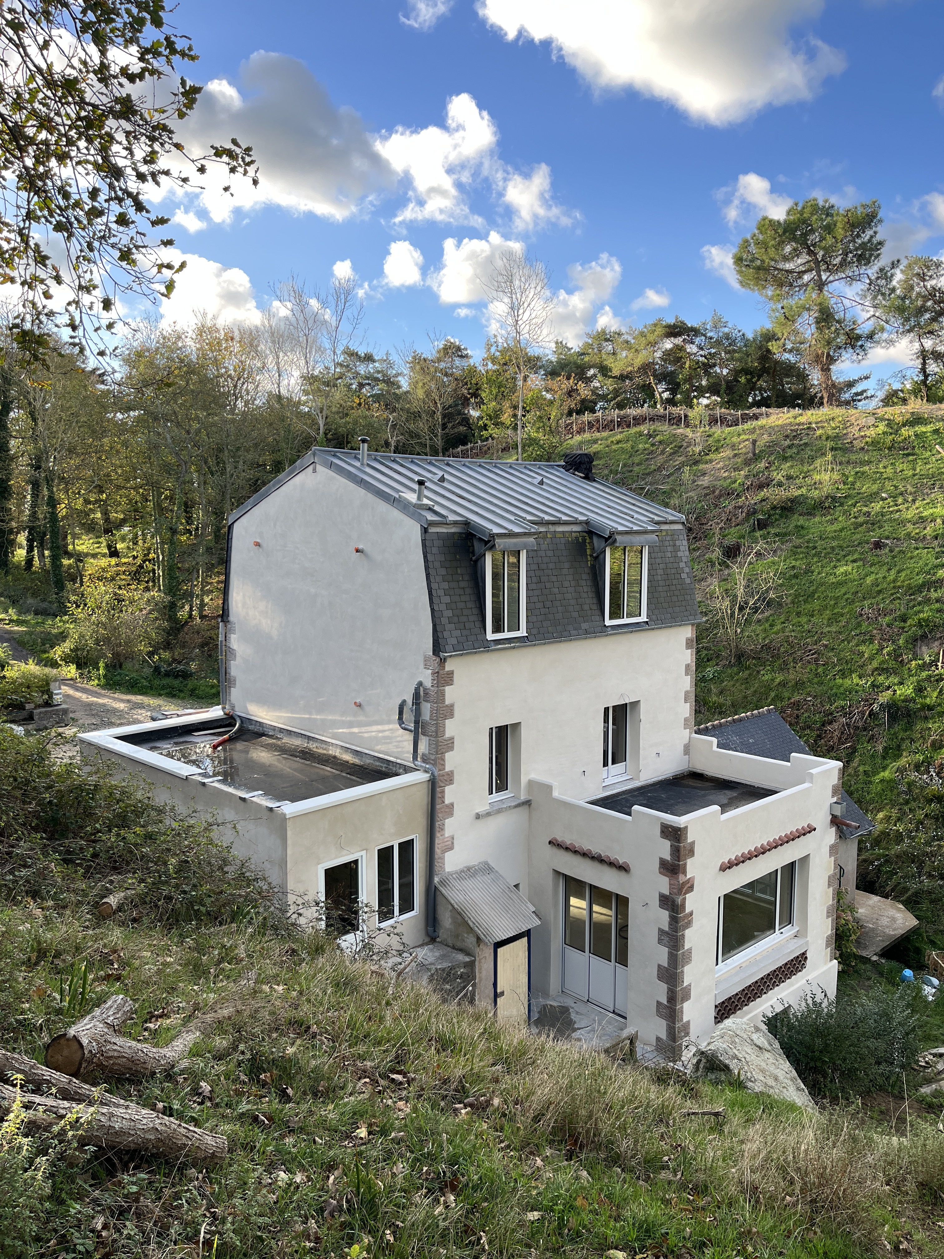 Le caractère remarquable et très protégé du site a rendu le parcours particulièrement exigeant : un an à travailler avec les architectes, un an d’autorisations, puis 14 mois de chantier pendant lesquels je me suis découverte maître d’œuvre. J’ai appris à gérer artisans et chantier, et j’en suis sortie grandie !