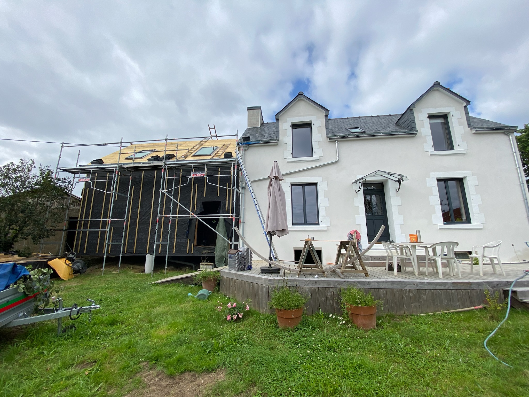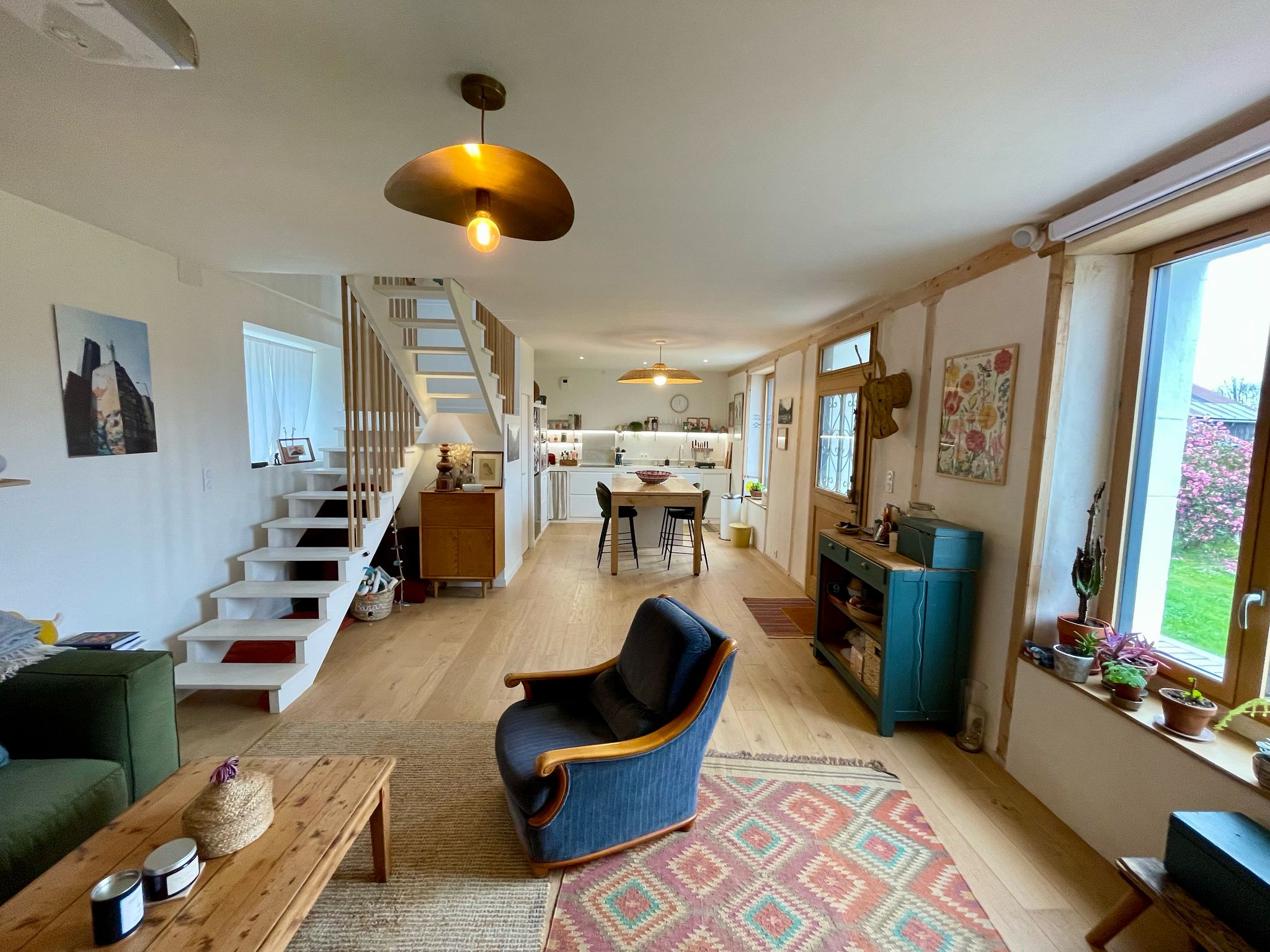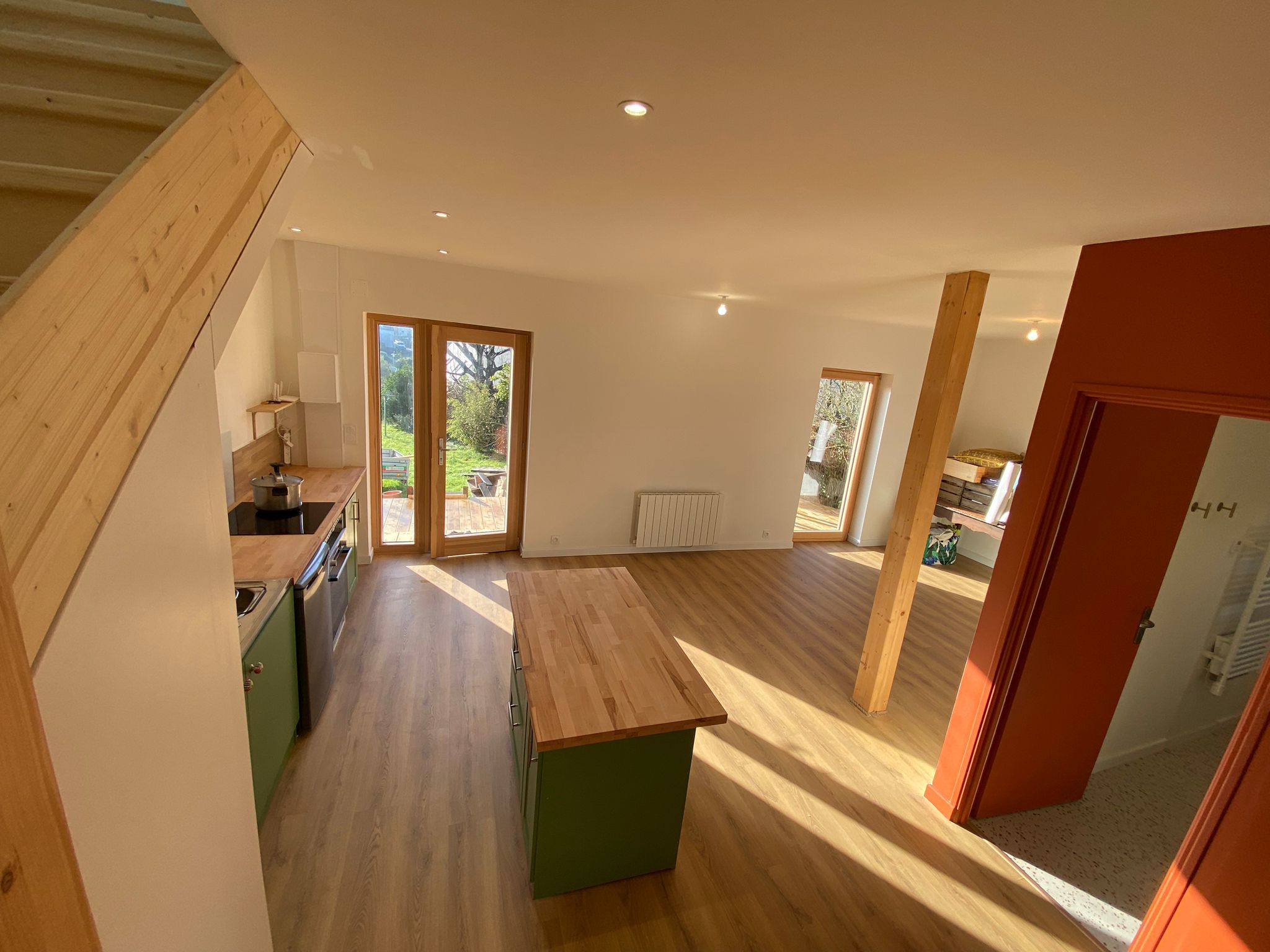Je vous accueille dans notre maison à Quimperlé, fruit de deux aventures complémentaires : la rénovation complète d’une maison en pierre de 1930 (2021) et la construction d’une extension ossature bois (2024-2025).
