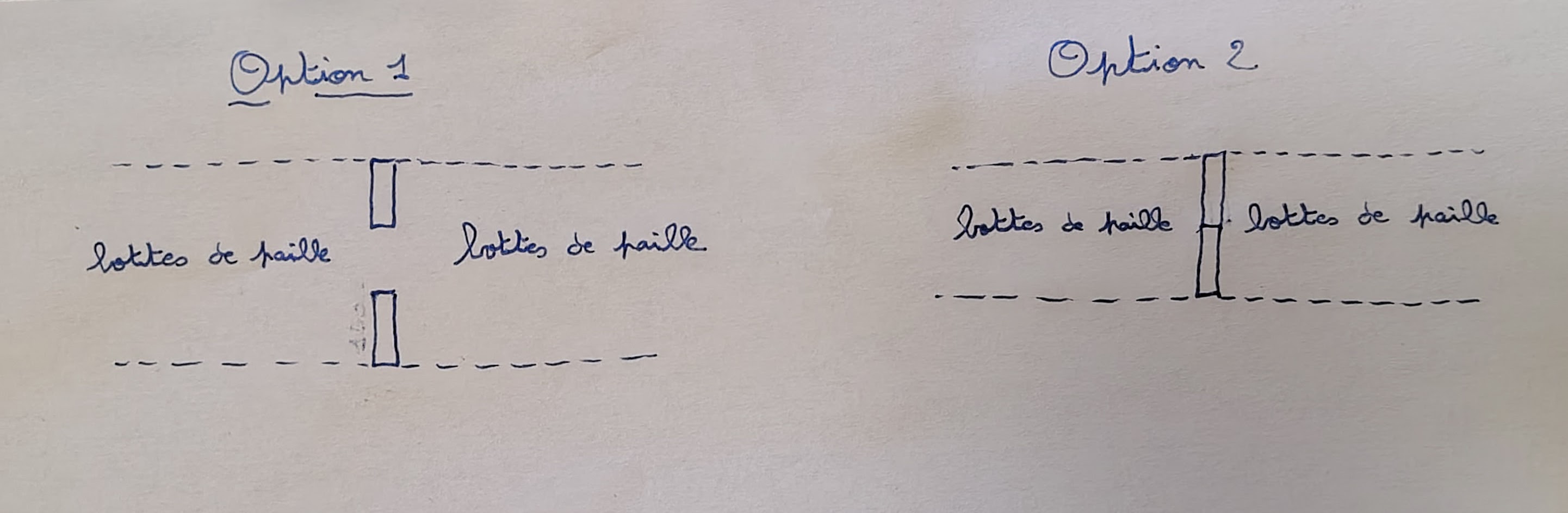 - l’option 1 sera compliquée à mettre en place, l’isolant entre les 2 ossatures doit être placé avant les bottes de paille ou en même temps. Cela prend du temps, et le temps, il n’y en a jamais assez. Pourtant cette option permet de faire un rupteur de pont thermique entre les 2 ossatures.
