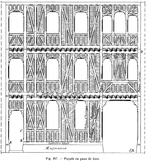 D’une manière générale, les pans de bois, qu’ils soient extérieurs ou intérieurs, sont à rez-de-chaussée, établis sur un petit mur variant de 0,50 à 1 mètre de hauteur, suivant les matériaux employés et la nature du sol, de manière à préserver les bois contre les causes de destruction résultant de l’humidité.